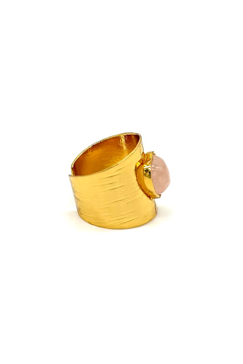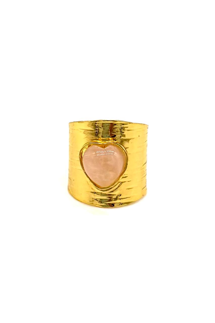 Anillo corazón cuarzo rosado, elaborado en bronce con baño en oro de 24 kilates, cuarzo rosado. Ajustable. Hecho a mano. Joyería contemporánea.Precio: 180,000 COP