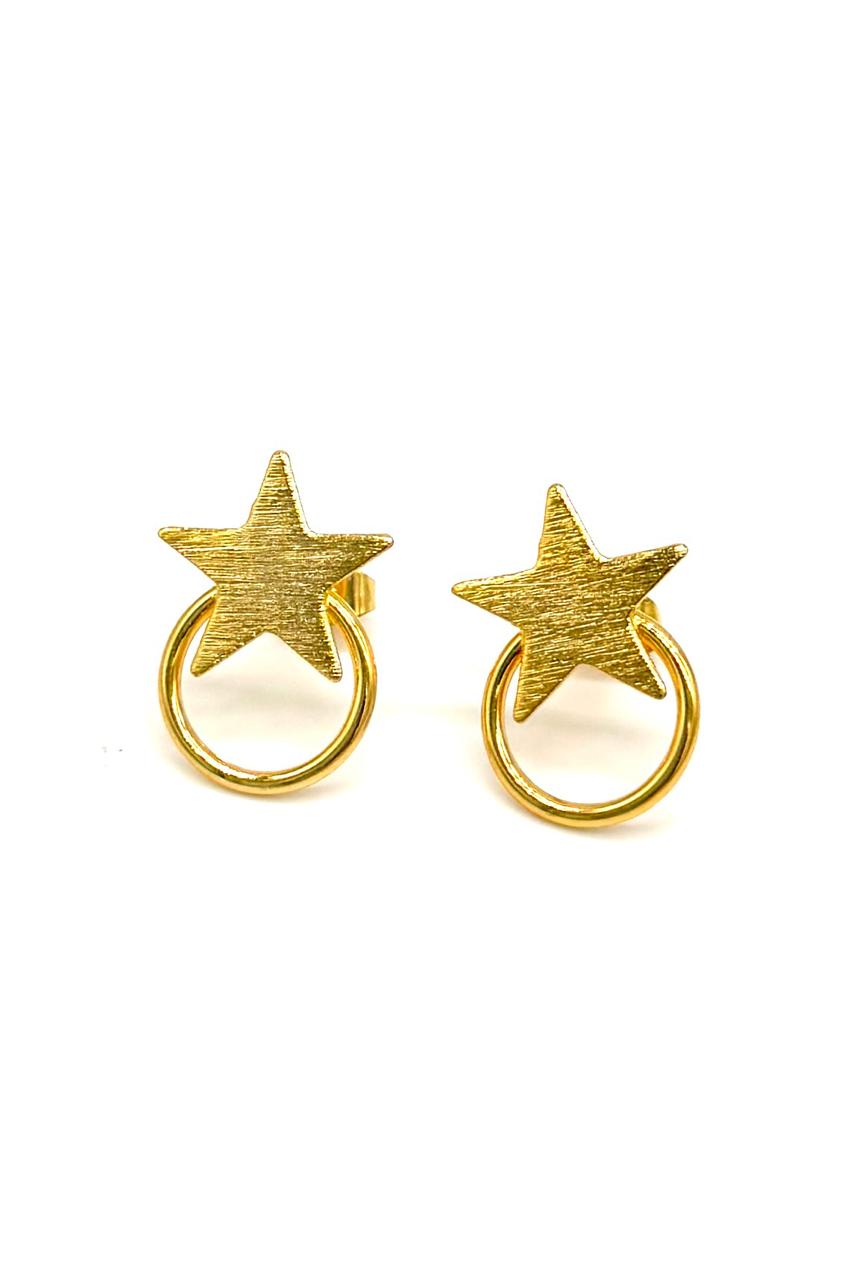 Aretes estrella elaborados en bronce con baño en oro de 24 kilates, matizados. Hecho a mano. Joyería artesanal.Precio: 80,000 COP