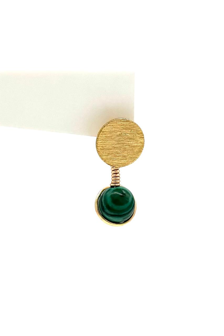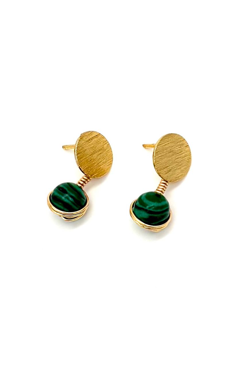 Aretes elaborados con piedra malaquita, hilo goldfield micra oro, topo matizado en bronce con baño en oro de 24 kilates.Precio: 90,000 COP