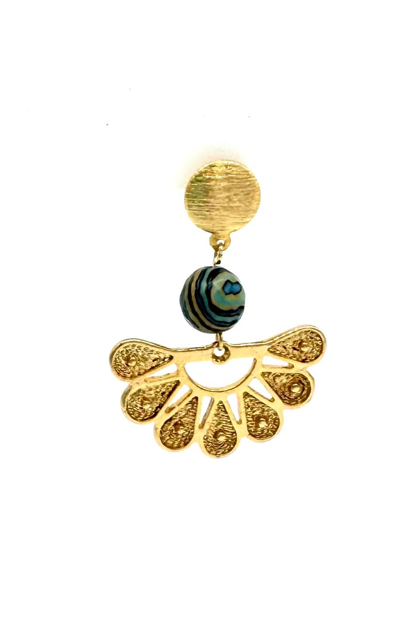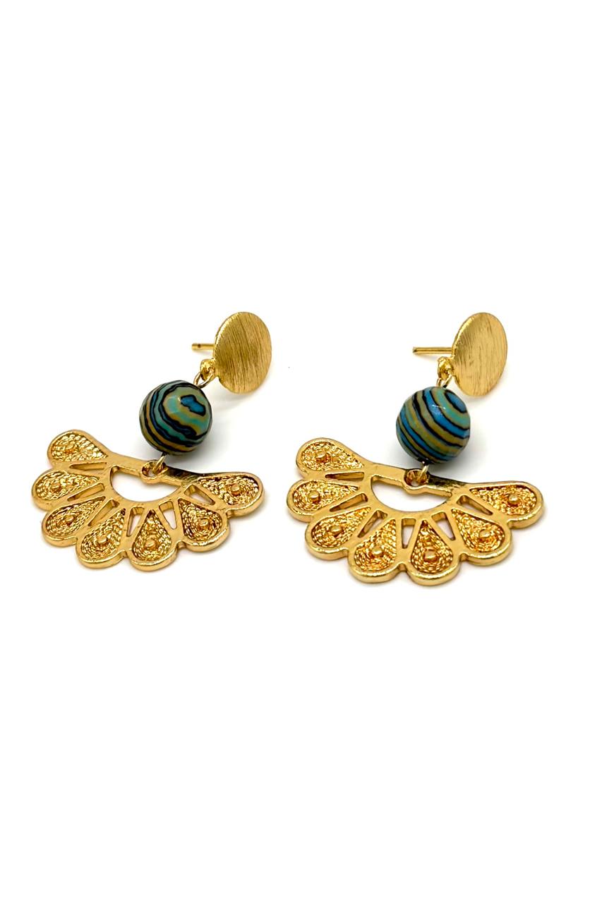 Aretes precolombinos elaborados en bronce con baño en oro de 24 kilates, piedras turquesas inyectadas, hilo goldfield micra oro.Precio: 140,000 COP