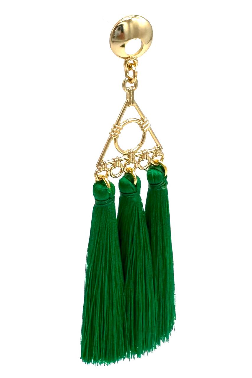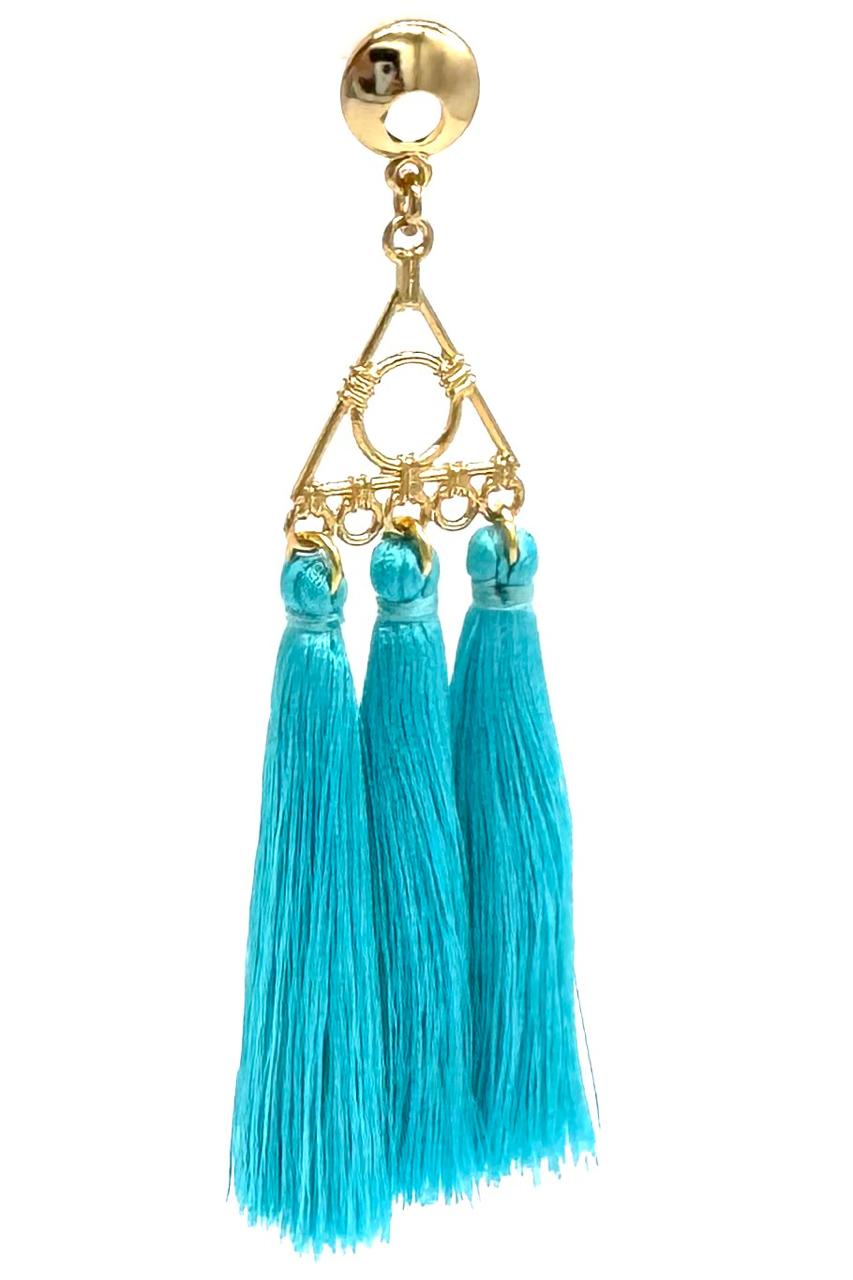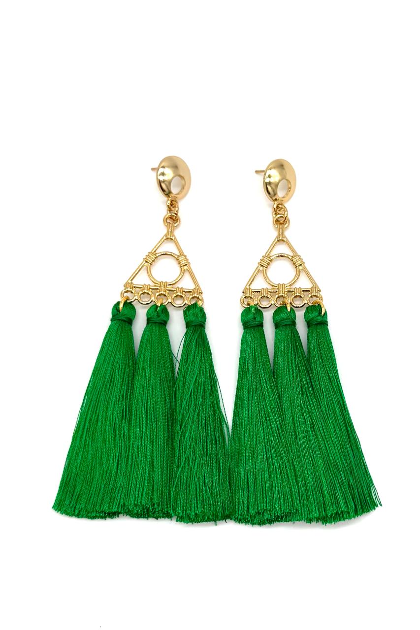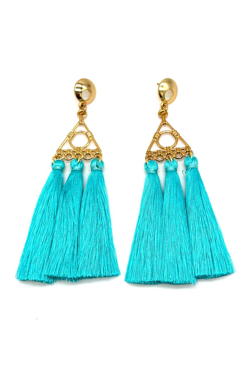 Aretes borlas elaborados en zamac con baño en oro de 24 kilates, borlas en hilo.Precio: 220,000 COP