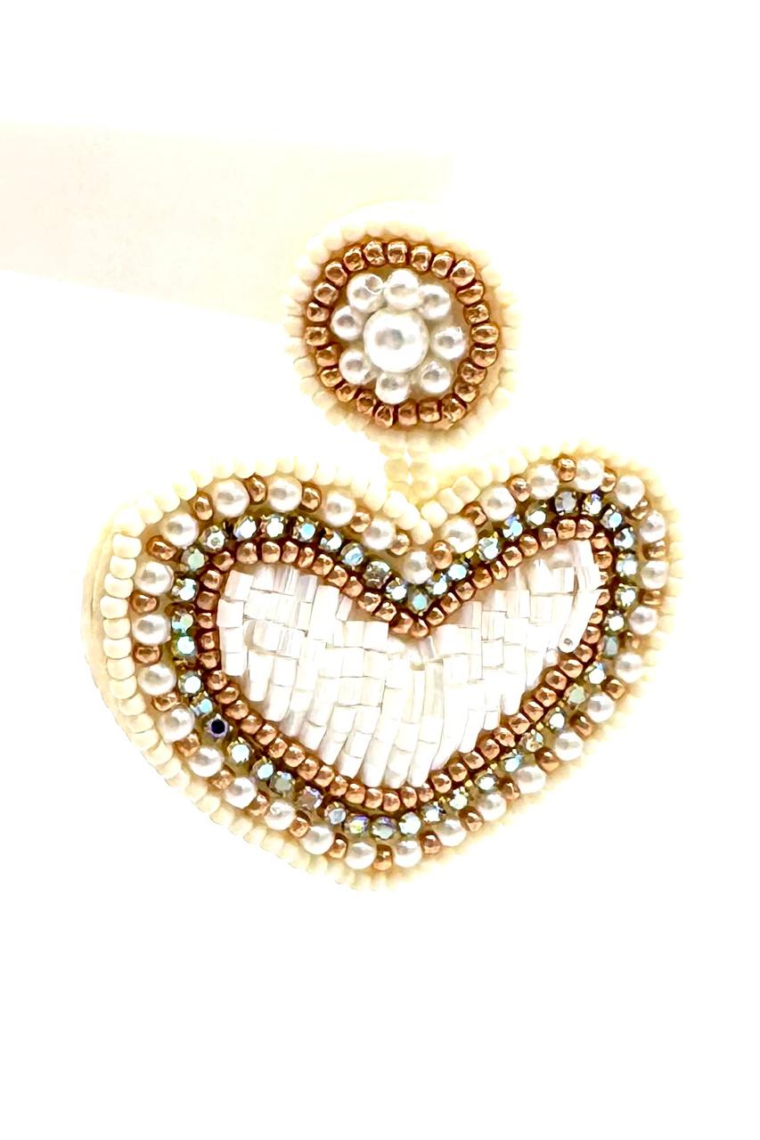 Aretes corazón elaborados en técnica de soutache, recamados a mano con mostacillas, canutillos, perlas Checas, strass, fieltro.Precio: 120,000 COP