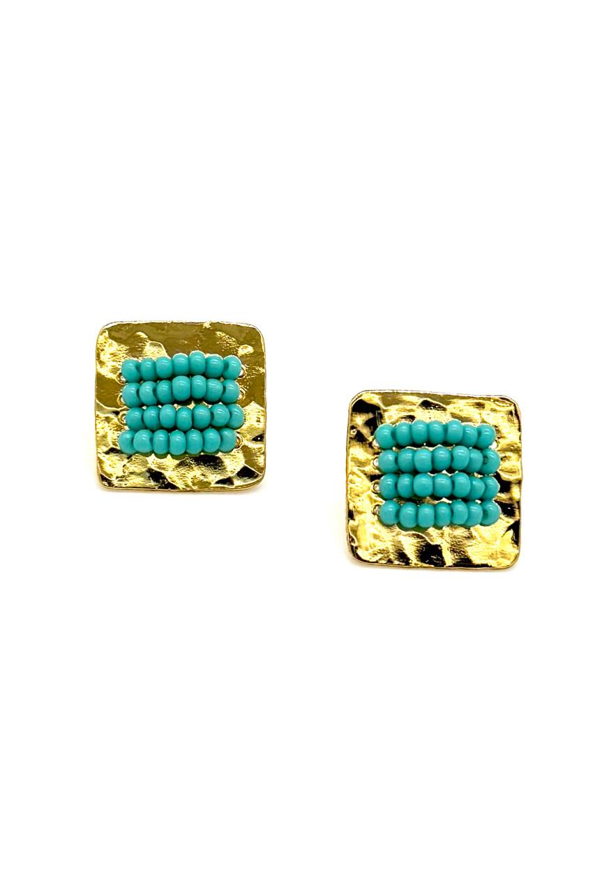 Aretes cuadrados elaborados en bronce con baño en oro de 24 kilates, tejidos en técnica de peyote con mostacillas Checas. Hecho a mano. Joyería contemporánea.Precio: 130,000 COP
