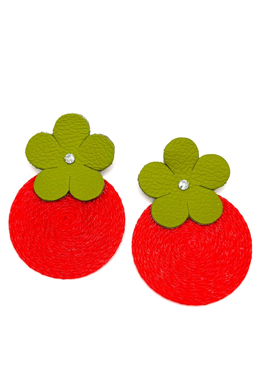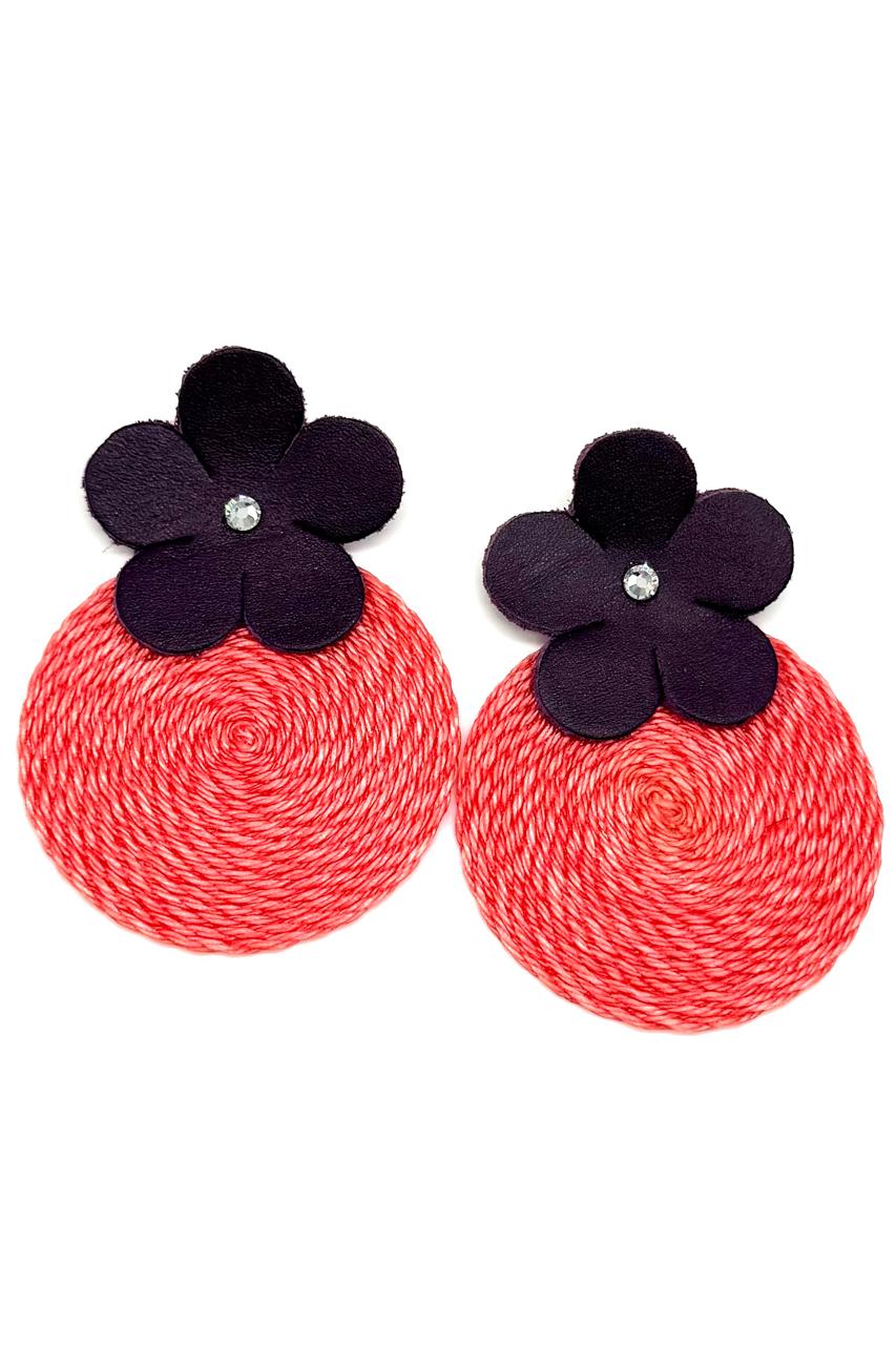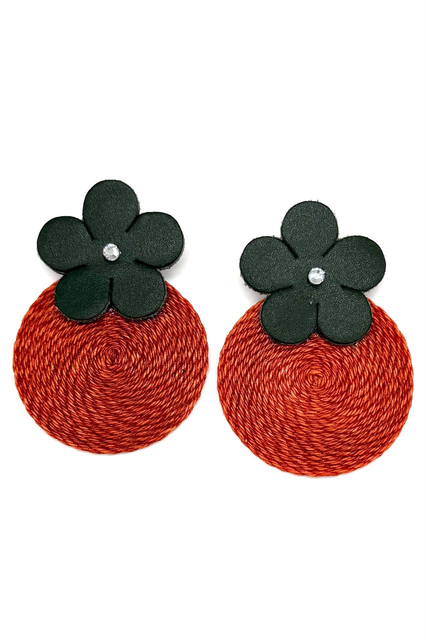 Aretes flor elaborados con cuero, fique engomado, cristal de Swarovski, topo en goldfield. Hecho a mano.Precio: 190,000 COP