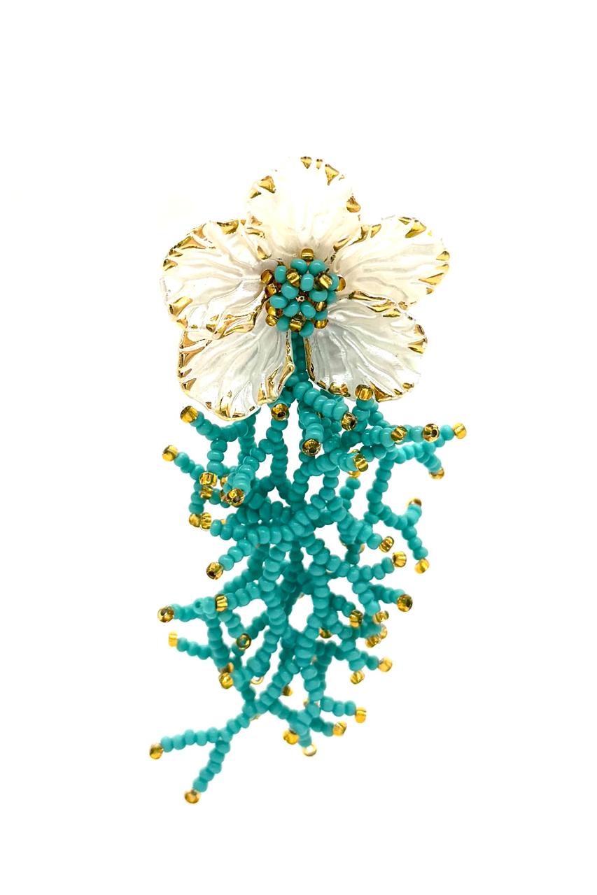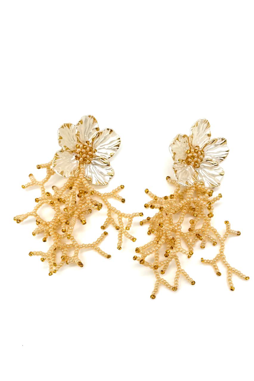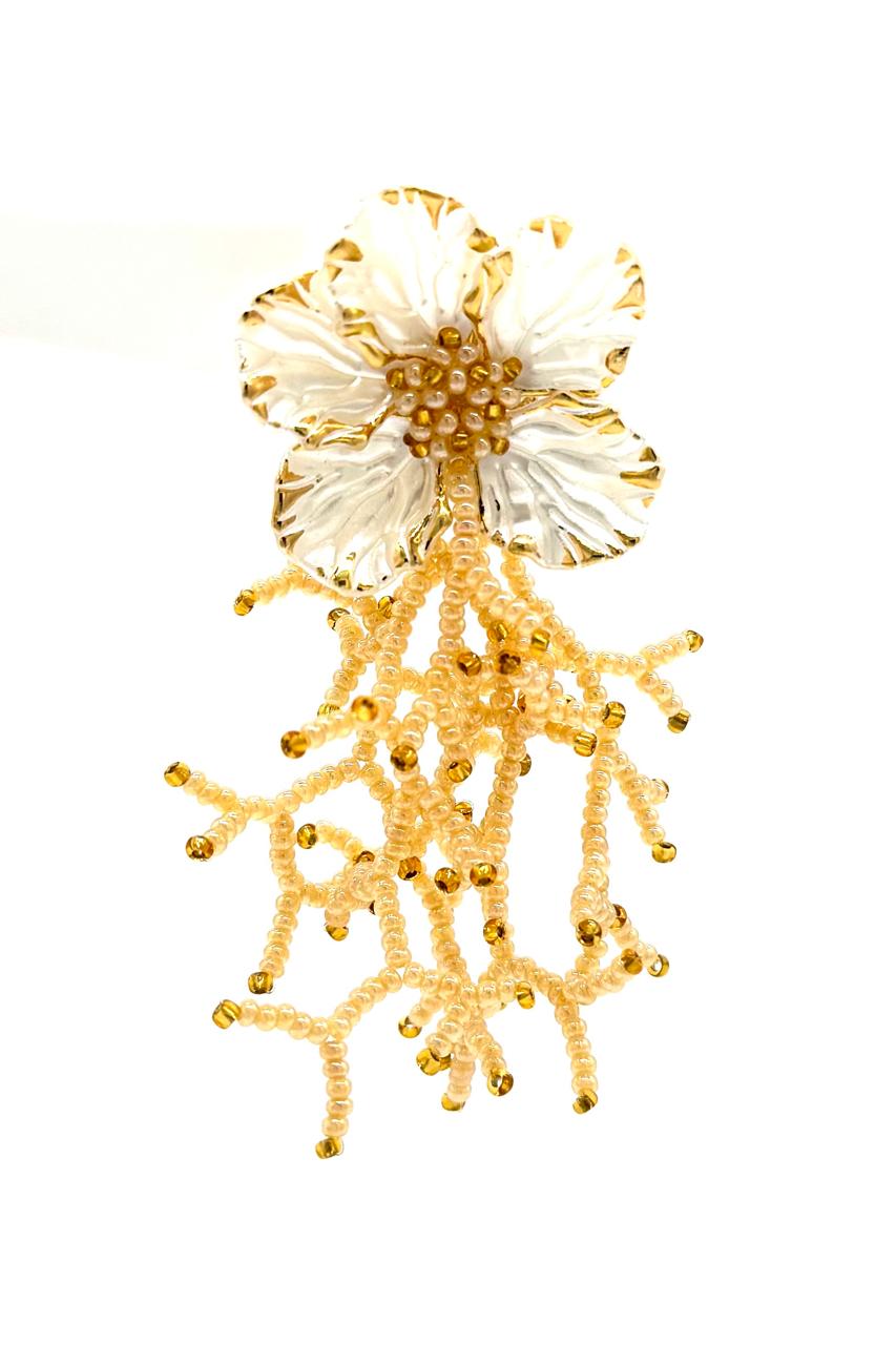 Aretes flor tipo nácar, elaboradas con flores sintéticas, mostacillas Checas, topo en goldfield, tejidos en técnica de peyote.Precio: 150,000 COP