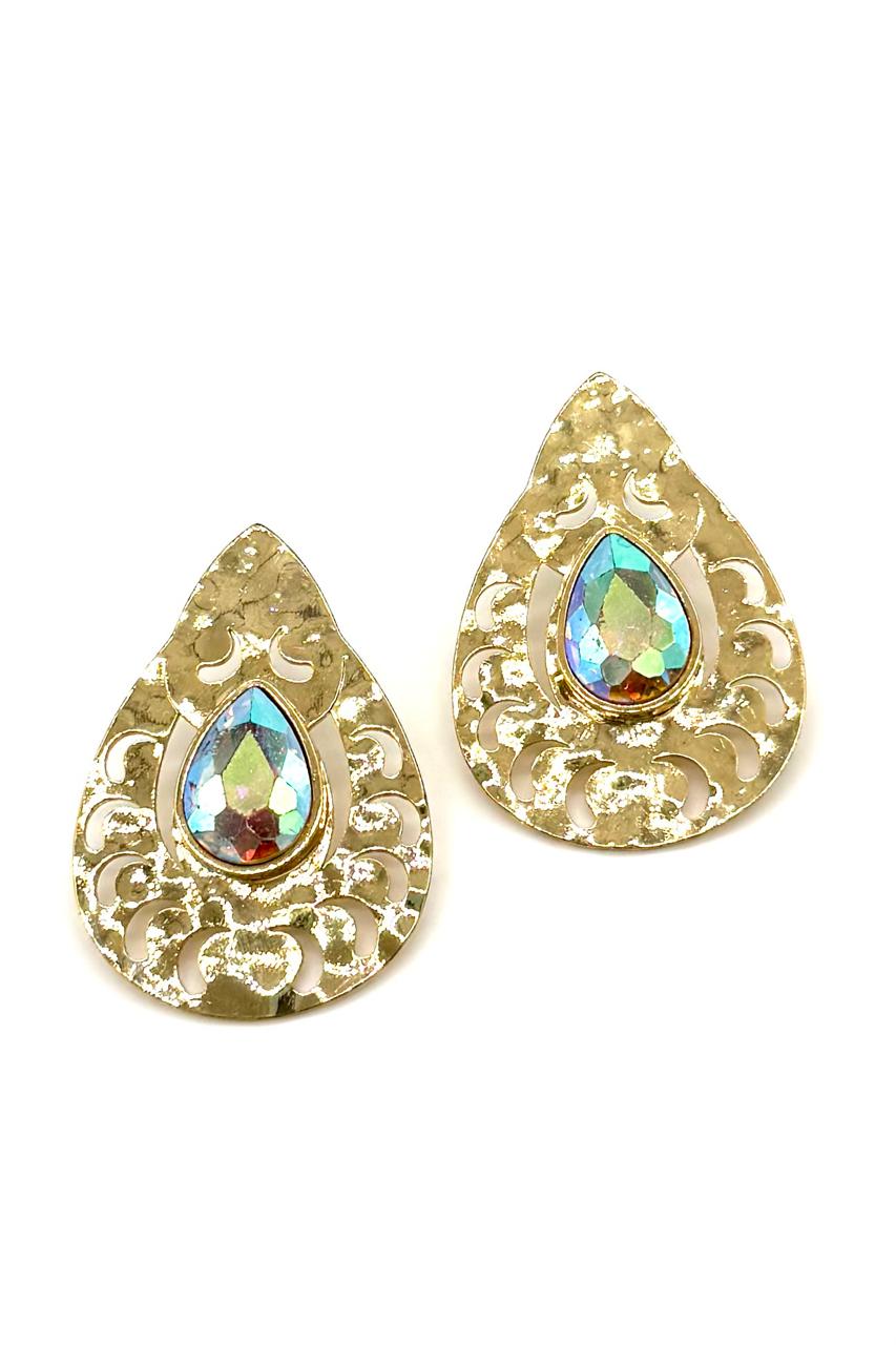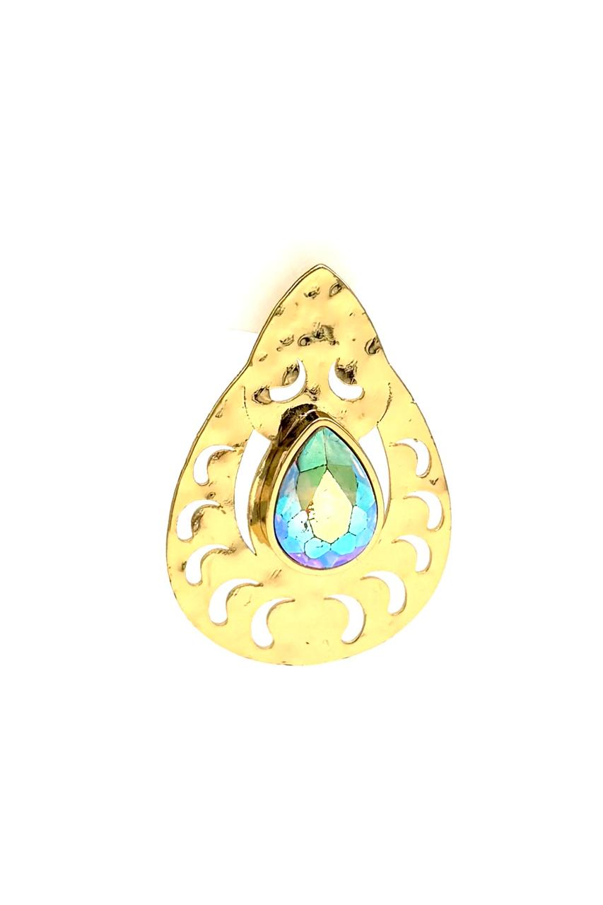 Aretes gota elaborados en bronce con baño en oro de 24 kilates, cristal aurora boreal.Precio: 130,000 COP