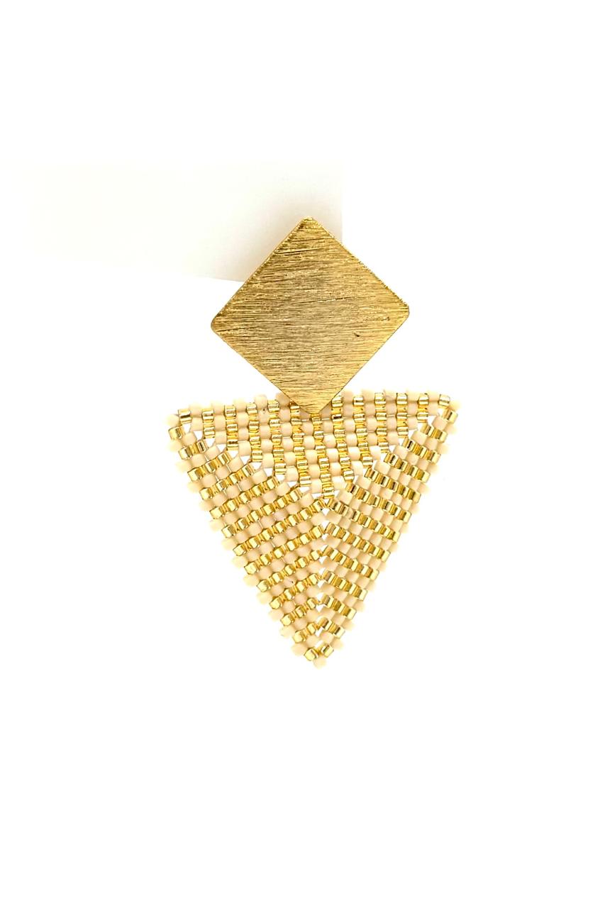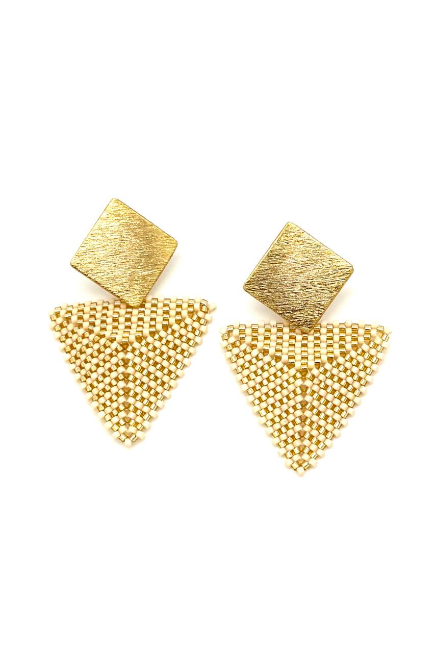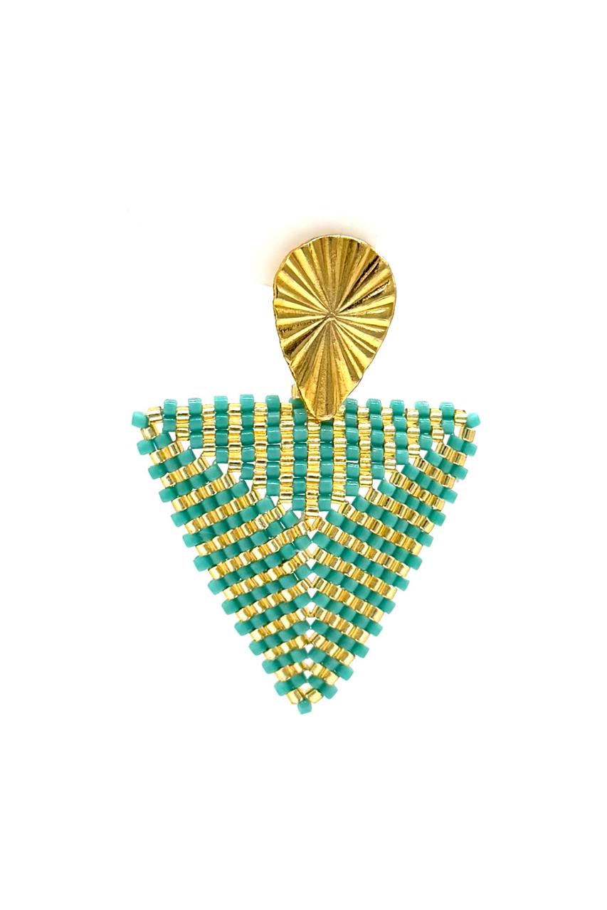 Aretes triángulo elaborados en bronce con baño en oro de 24 kilates, tejidos en técnica de miyuki. Hecho a mano. Joyería artesanal.Precio: 220,000 COP
