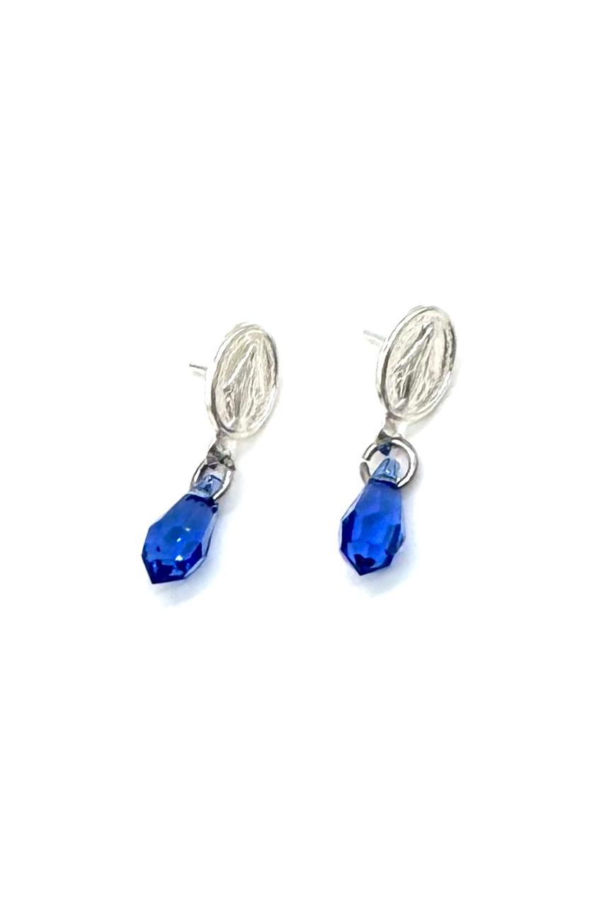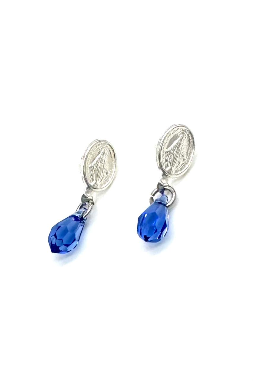 Aretes topo Virgen Milagrosa elaborados en plata ley 9.25, cristales de Swarovski.Precio: 110,000 COP