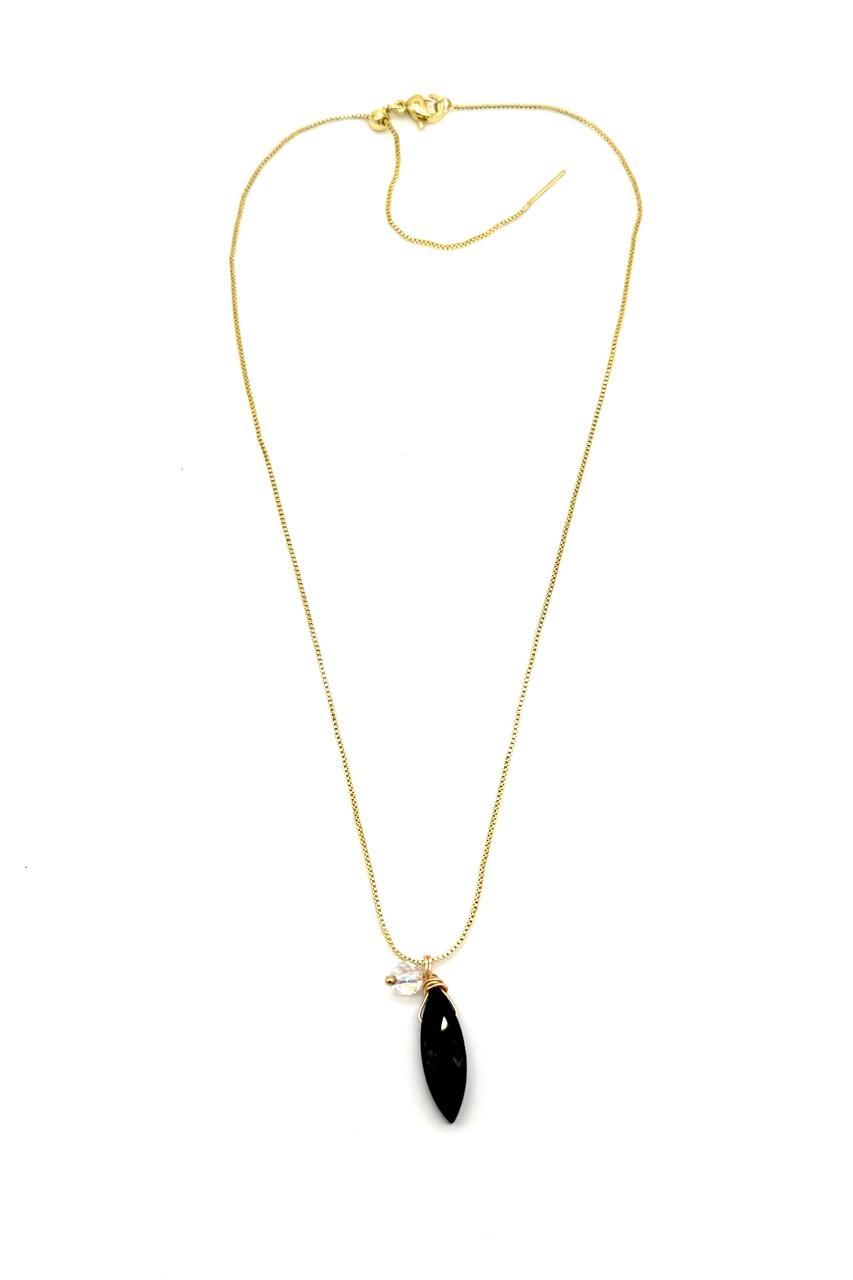 Cadena en rodio elaborada con cristal Checo facetado negro, cristal Murano aurora boreal, hilo goldfield. Ajustable.Precio: 90,000 COP
