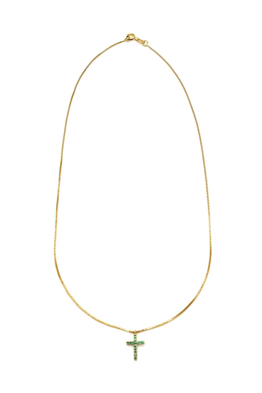 Cadena cruz elaborada en oro laminado de 18 kilates, zircones verde esmeralda. Garantía 1 año en color.Precio: 280,000 COP