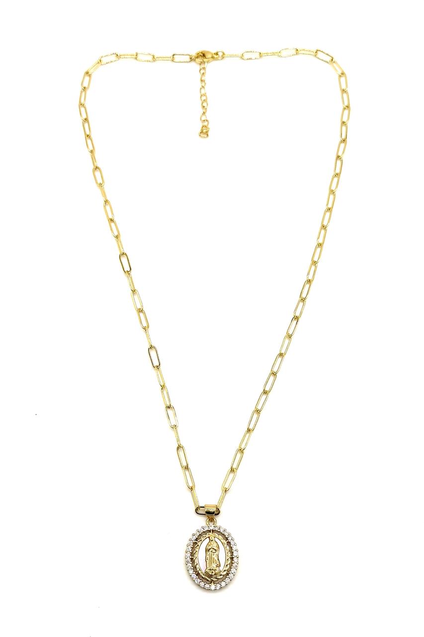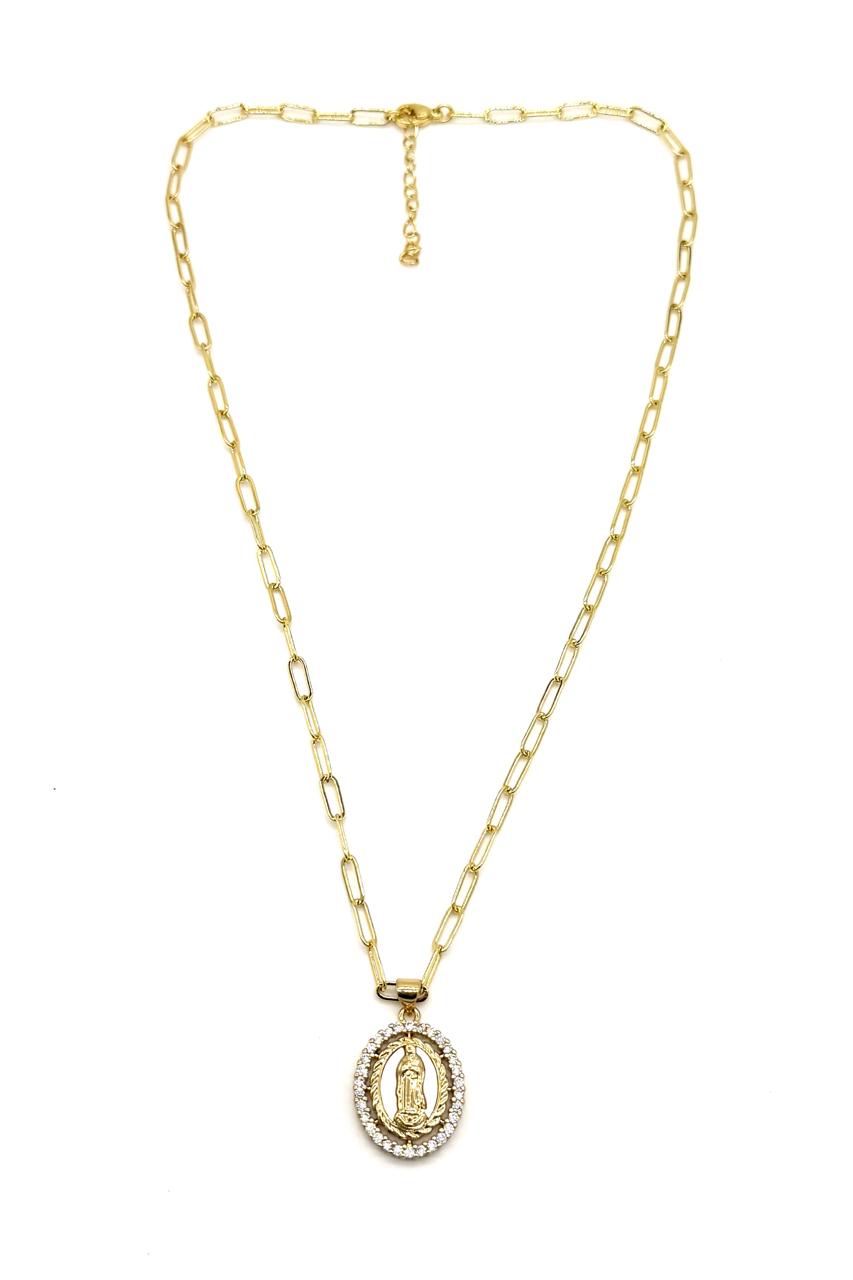 Cadena medalla de La Virgen de Guadalupe elaborada en rodio, nácar y micro zircón.Precio: 130,000 COP