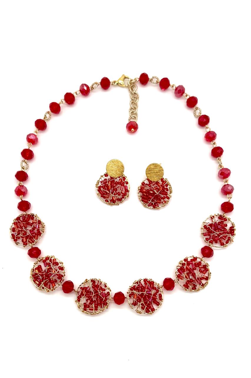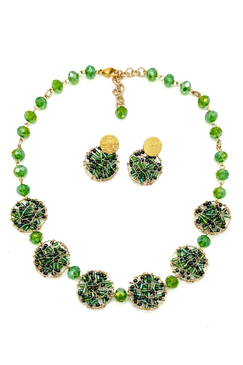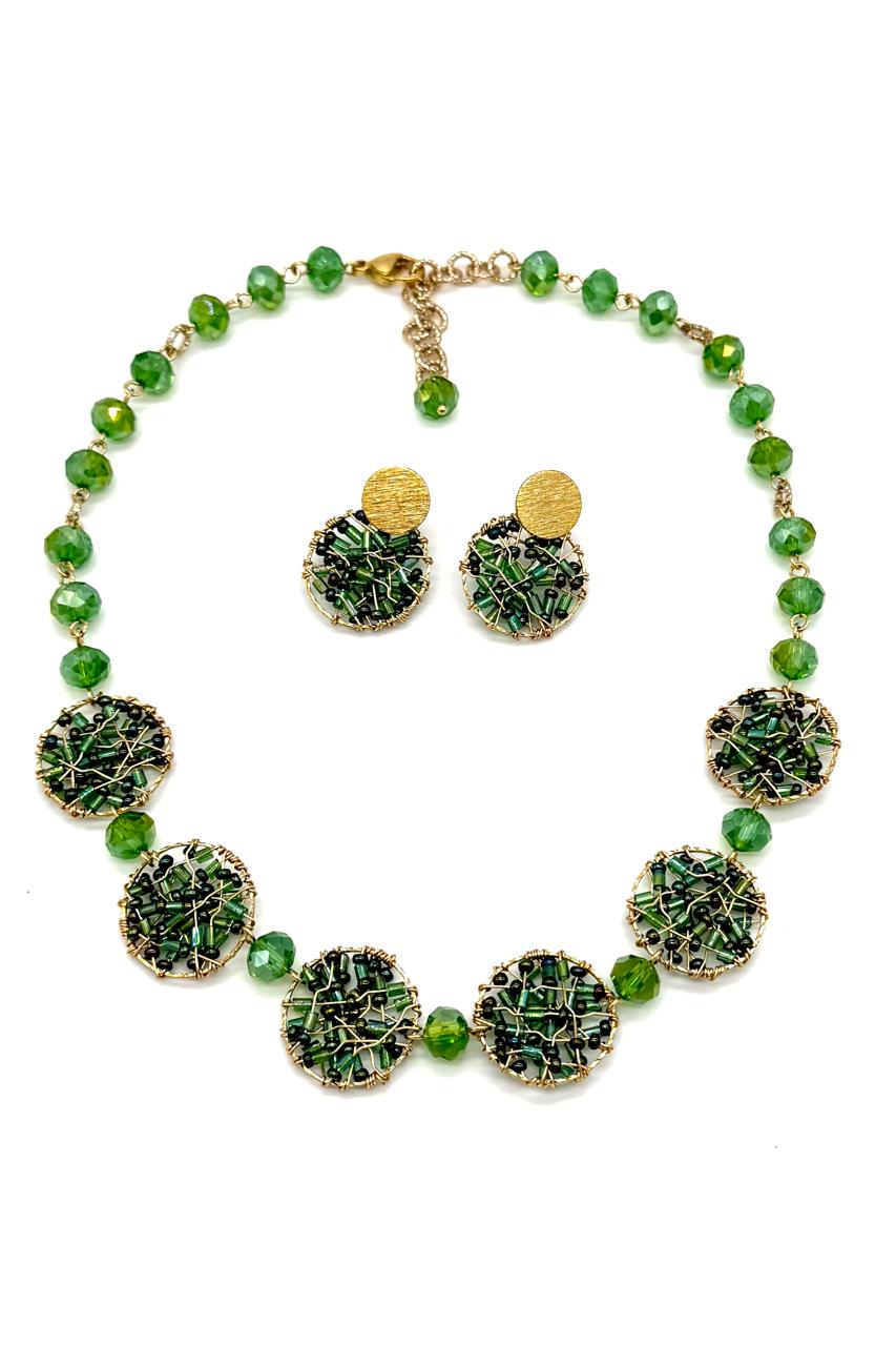 Collar alambrismo elaborado con cristales Checos, hilo goldfield micra oro, argollas rodinadas, topo matizado en bronce con baño en oro de 24 kilates.Precio: 360,000 COP