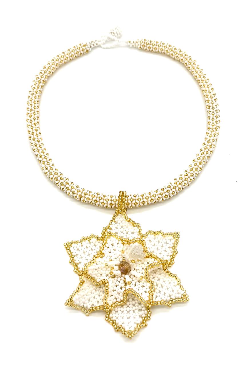 Collar flor elaborado en 3D con mostacillas Checas, tejido en técnica de peyote. Hecho a mano.Precio: 320,000 COP