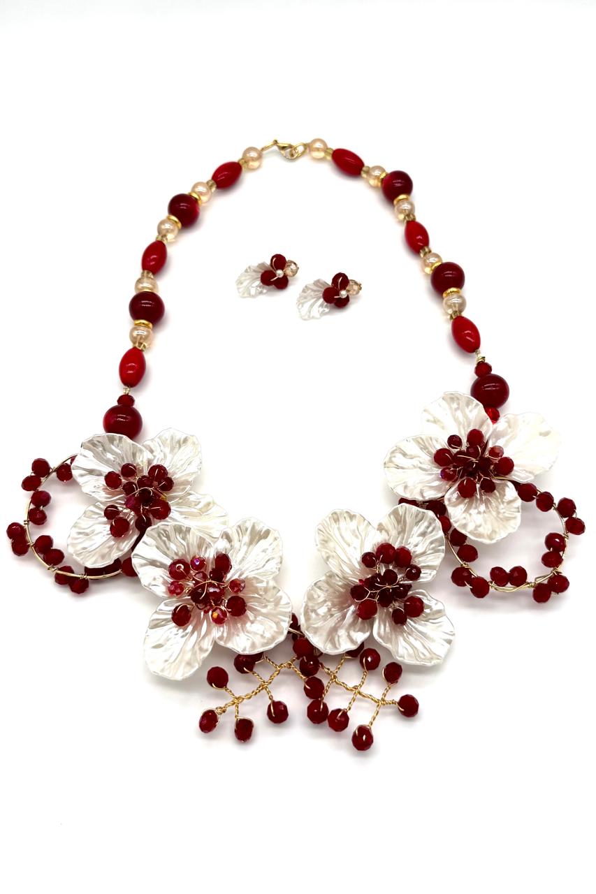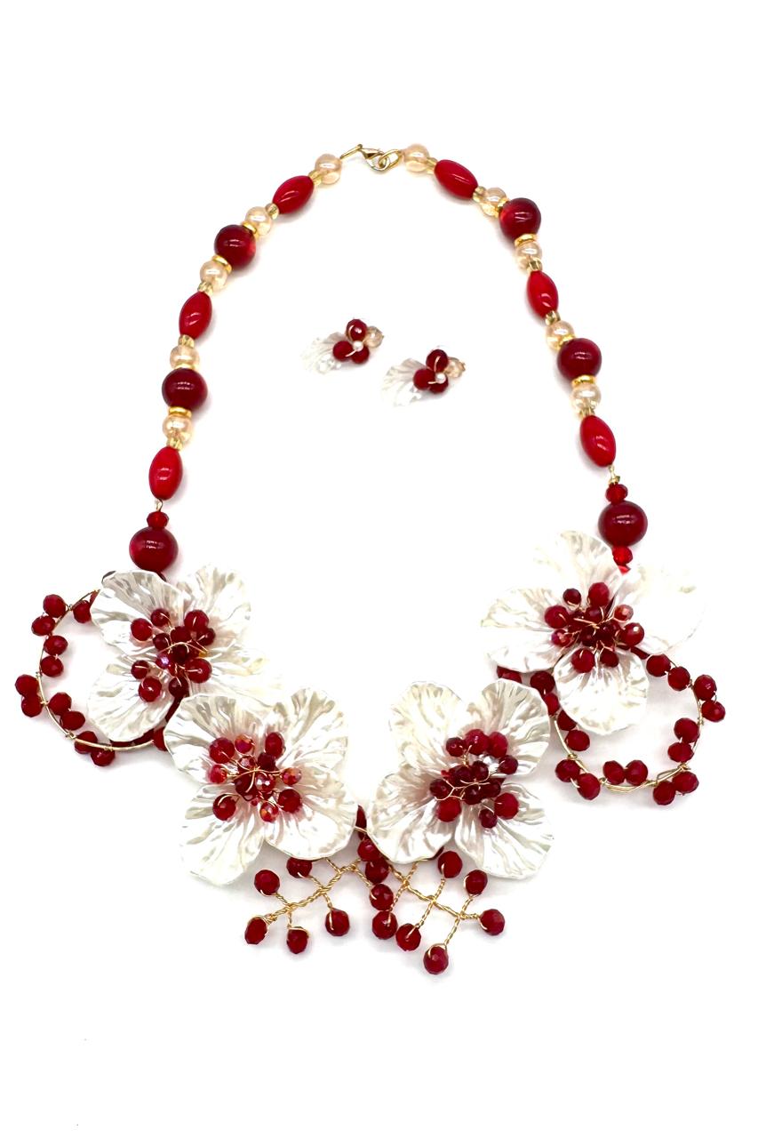 Collar elaborado con flores tipo nácar, tejido en técnica de alambrismo con cristales Checos, hilo goldfield, cristal indian glass, sintéticas ojo de gato.Precio: 450,000 COP