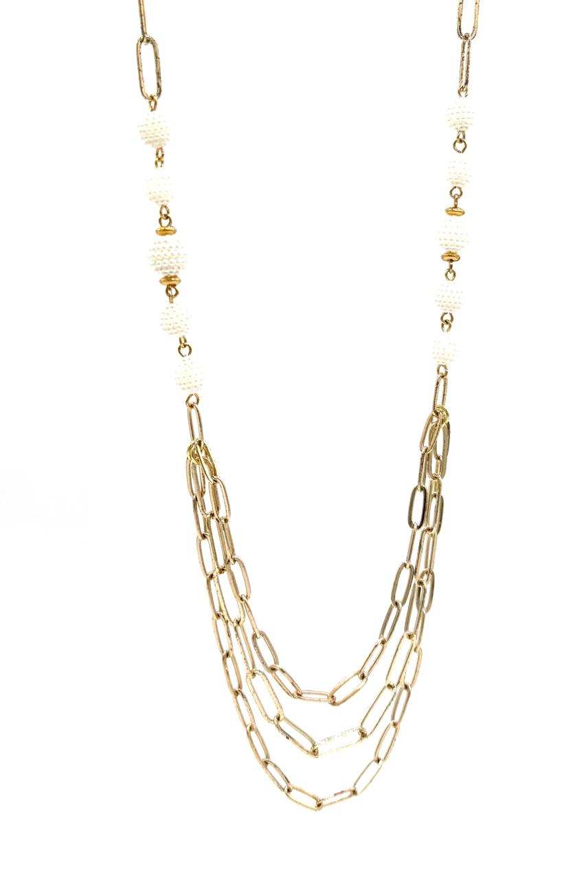 Collar largo elaborado con moritas tipo perla, cadena en rodio, topos martillados en bronce con baño en oro de 24 kilates.Precio: 270,000 COP
