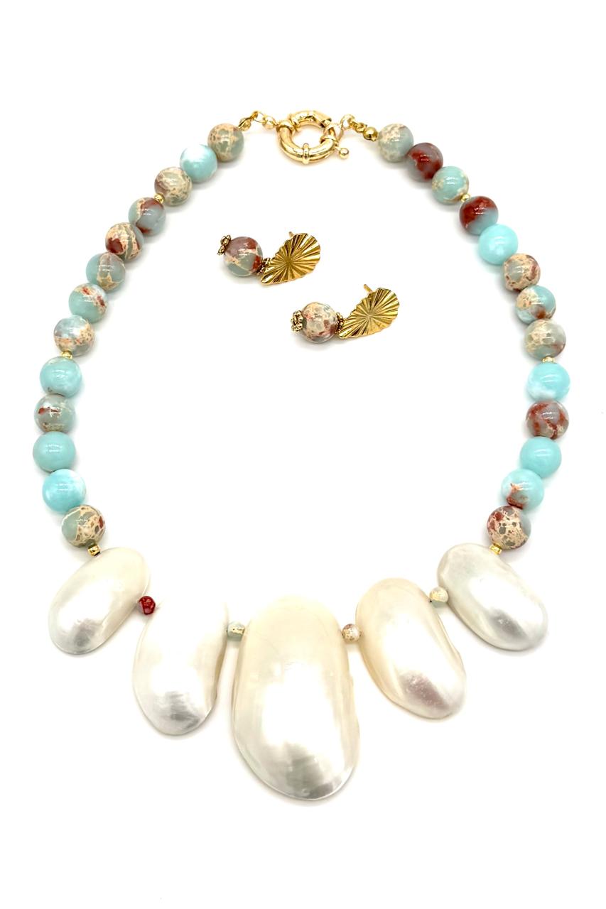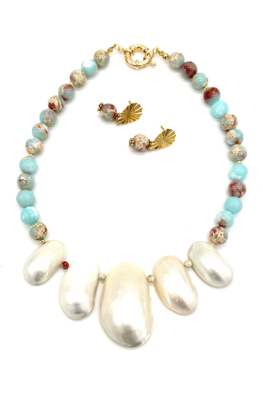 Collar elaborado con nácar, piedra jaspe piel de serpiente, topos en bronce con baño en oro de 24 kilates, balines en oro laminado 18k.Precio: 700,000 COP