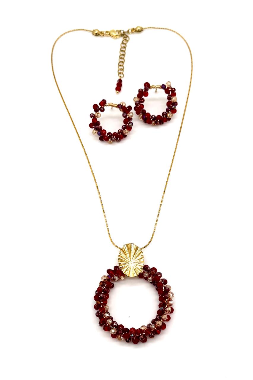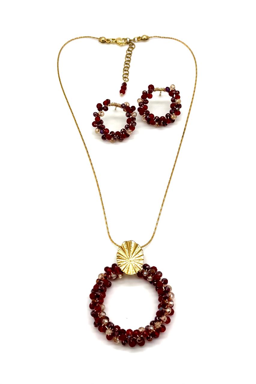 Juego elaborado en alambrismo con cristales Checos, cadena en acero, aros en goldfield, dije en bronce con baño en oro de 24 kilates, hilo goldfield.Precio: 250,000 COP