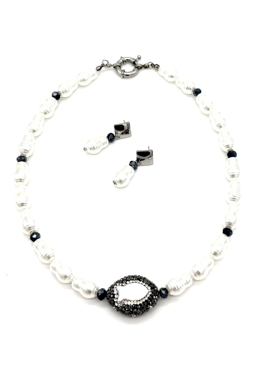 Juego marquesita elaborado con cristales Checos, perlas sintéticas, dije en marquesita y nácar, topo y broche en acero.Precio: 270,000 COP