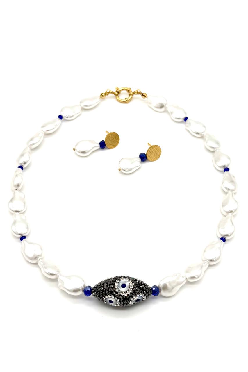 Juego marquesita elaborado con perlas sintéticas, marquesita con nácar, topo matizado en bronce con baño en oro de 24 kilates, broche en acero.Precio: 270,000 COP