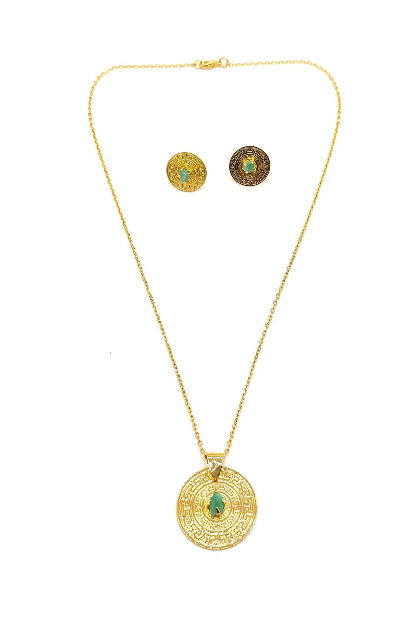 Juego moneda elaborado en bronce con baño en oro de 24 kilates, murralla esmeralda. Hecho a mano. Joyería contemporánea.Precio: 240,000 COP