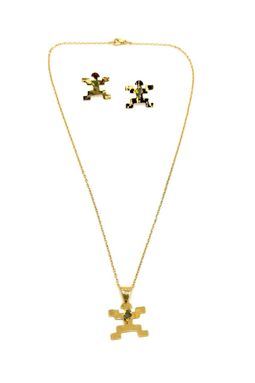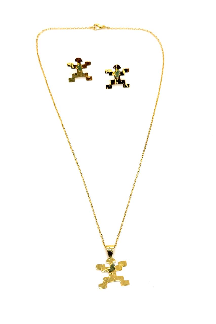 Juego Muisca elaborado en bronce con baño en oro de 24 kilates, murralla esmeralda. Hecho a mano. Joyería contemporánea.Precio: 250,000 COP