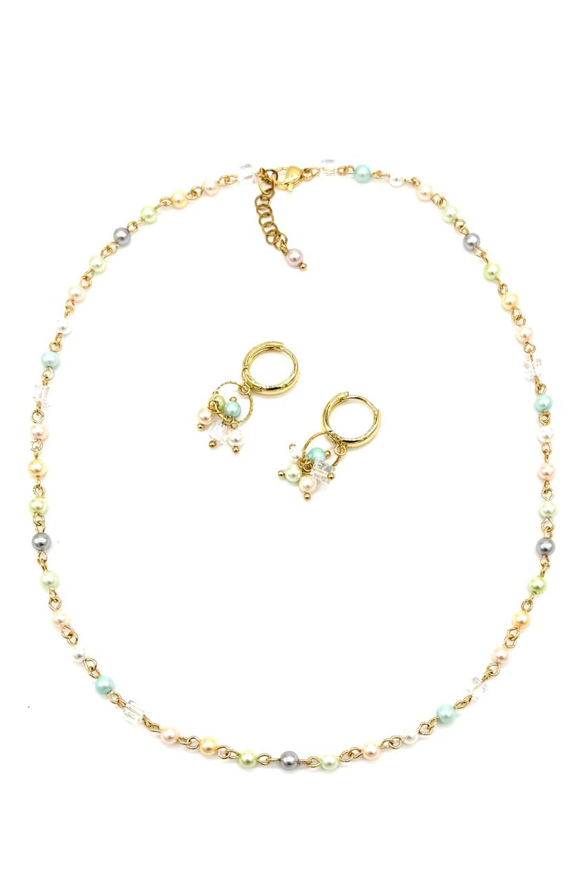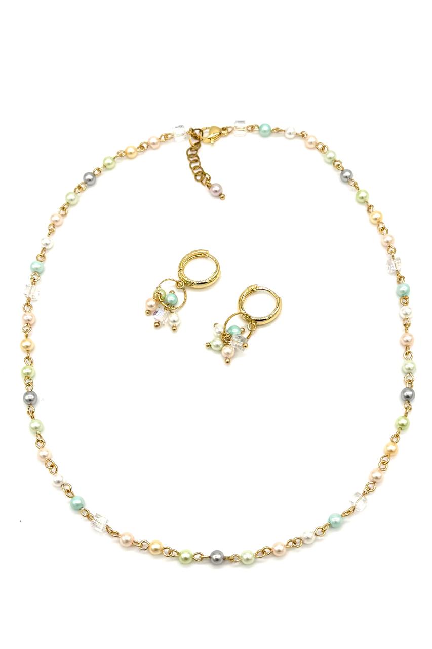 Juego perla polvo de nácar elaborado con hilo goldfield micra oro, cristal murano aurora boreal, candonga en rodio.Precio: 240,000 COP