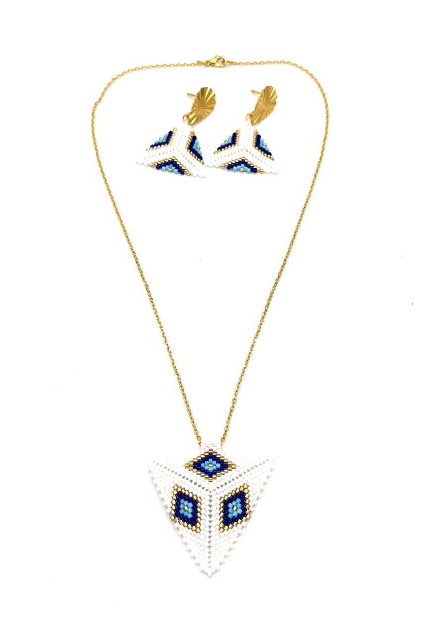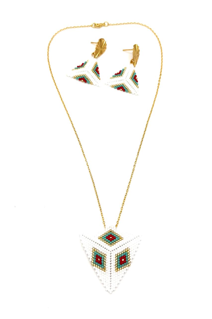 Juego triángulo elaborado en miyuki, cadena y topos en bronce con baño en oro de 24 kilates. Hecho a mano. Joyería artesanal.Precio: 370,000 COP