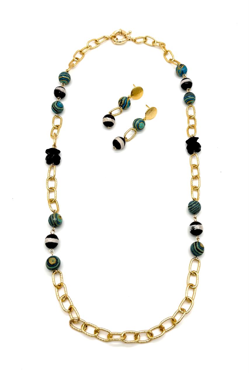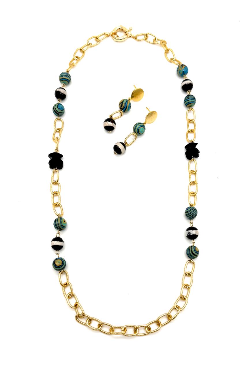 Juego elaborado con piedras turquesas inyectadas, ágatas negras, oso en cristal Checo, cadena en aluminio rodinado, topo en bronce con baño en oro de 24 kilatesPrecio: 290,000 COP