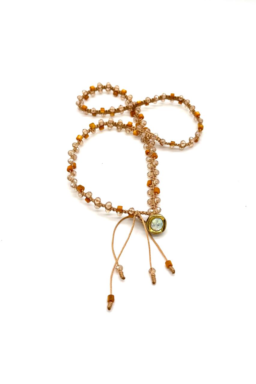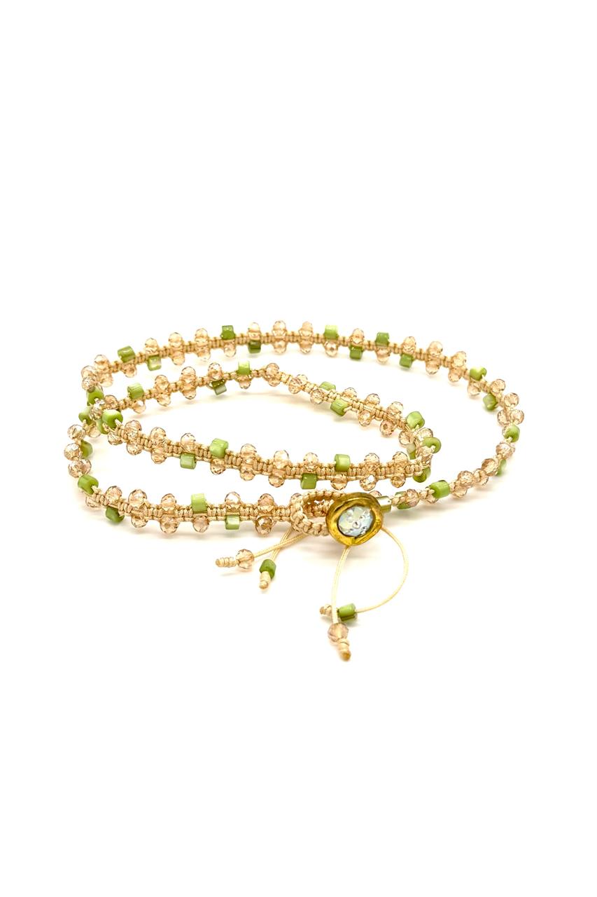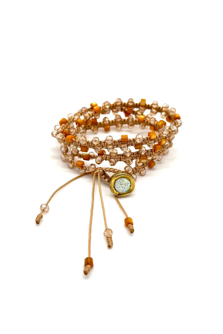 Pulsera 3 vueltas elaborada con hilo Coreano, nácar, cristales Checos, botón en zamac.Precio: 170,000 COP