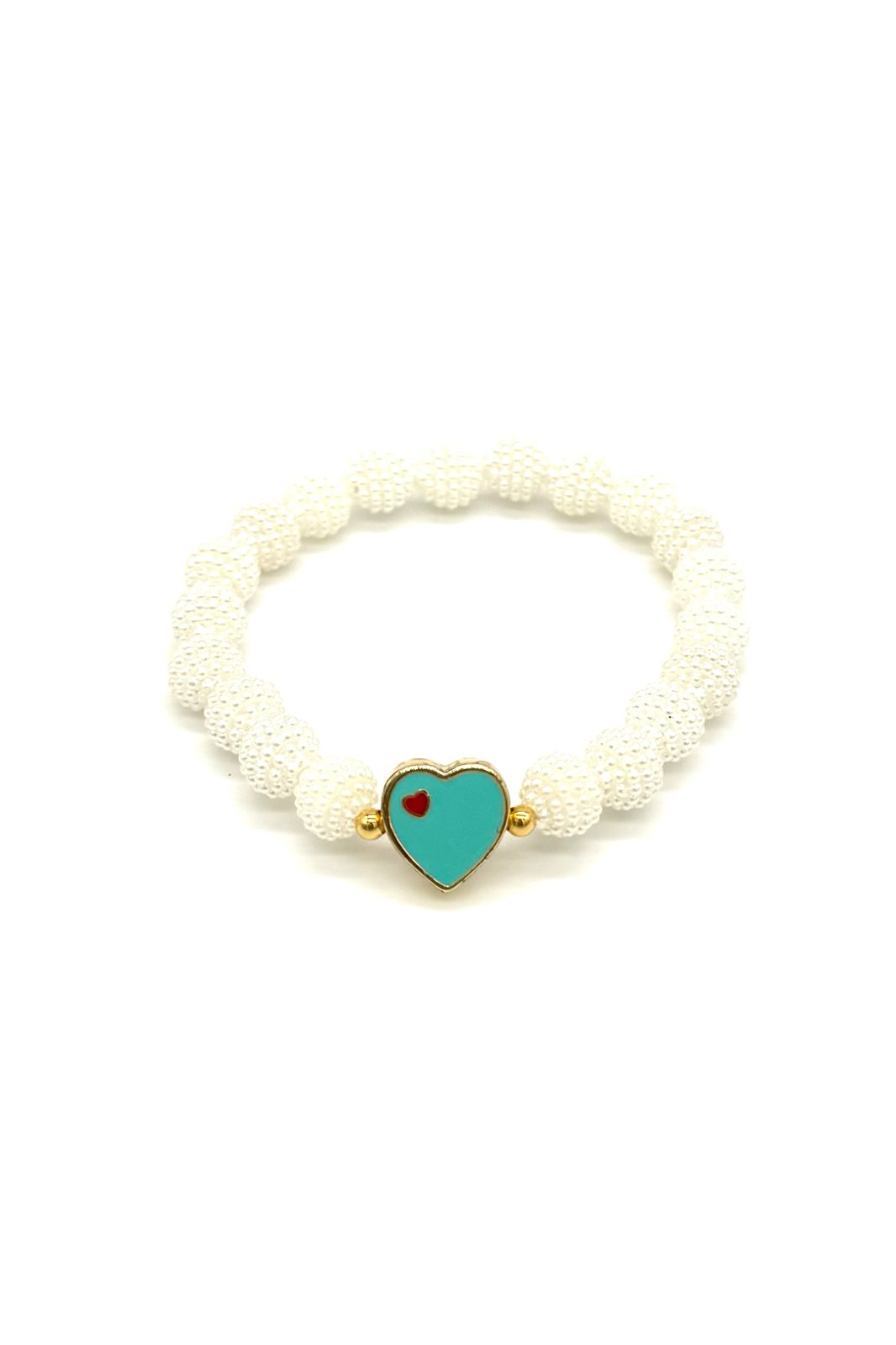 Pulsera corazón porcelanizado elaborada en rodio, balines en oro laminado 18 kilates, moritas tipo perla sintéticas. Encauchada.Precio: 120,000 COP