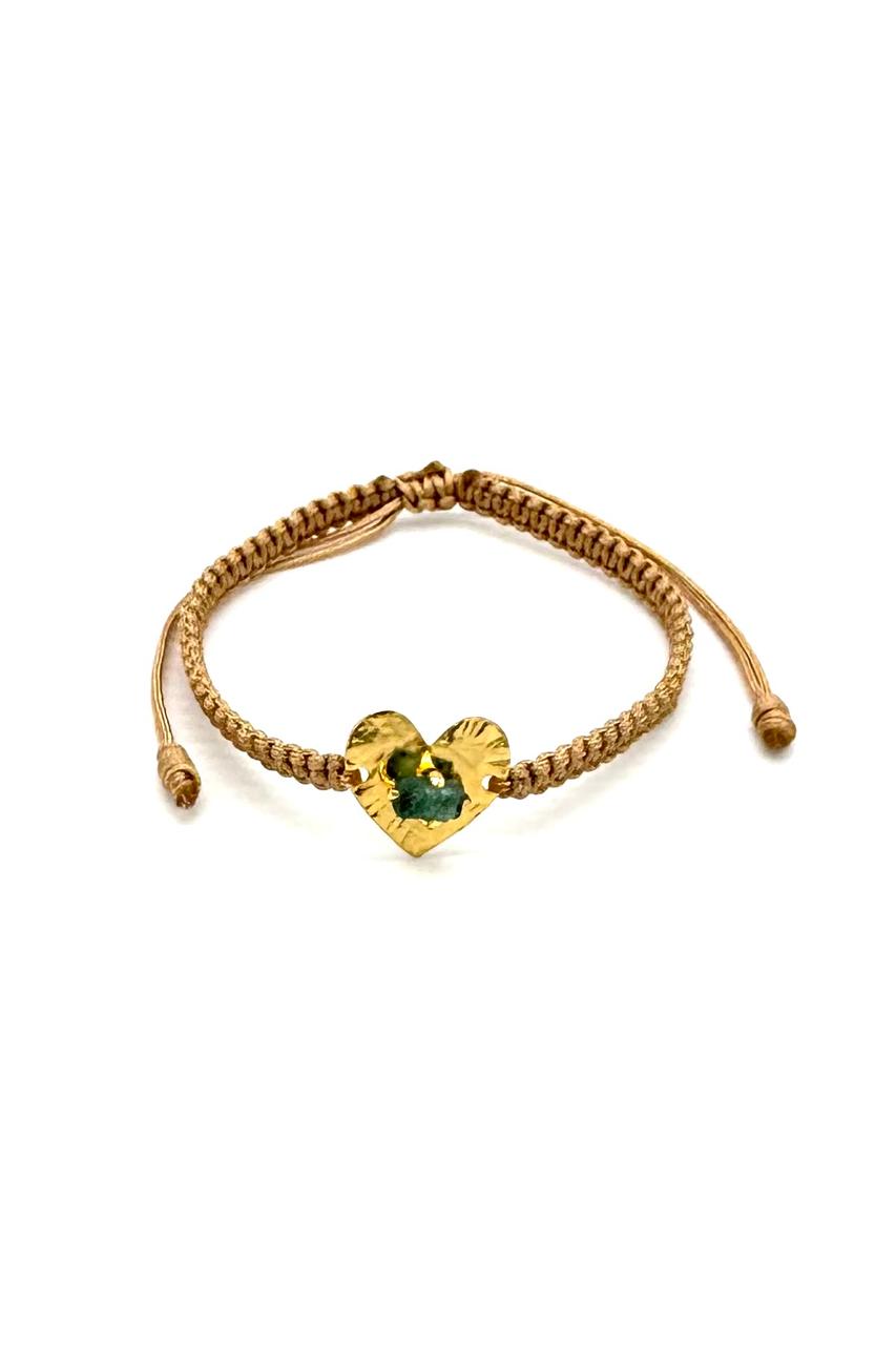 Pulsera corazón elaborada en bronce con baño en oro de 24 kilates, murralla esmeralda, hilo Coreano. Ajustable. Joyería contemporánea.Precio: 110,000 COP