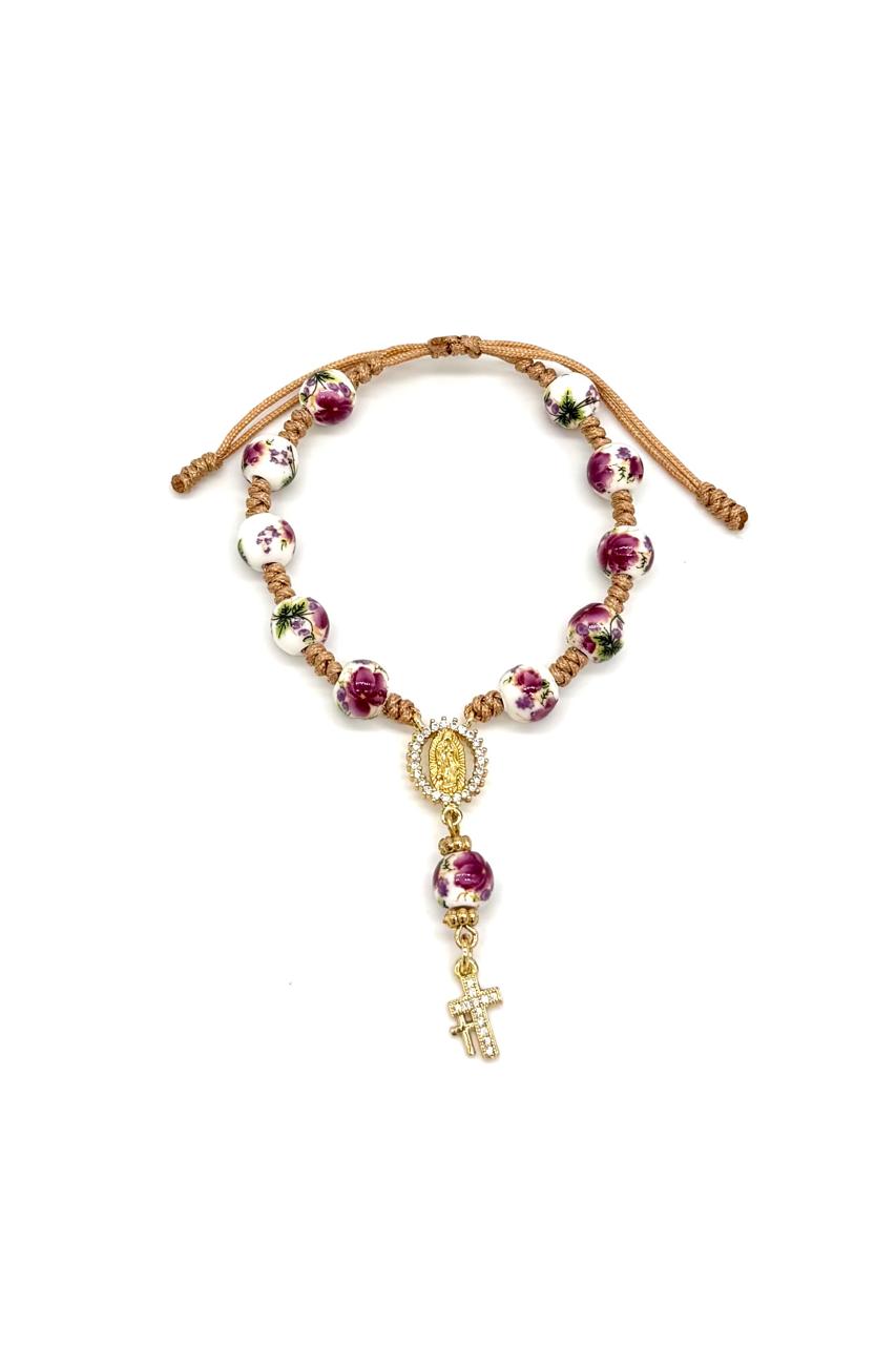 Pulsera denario elaborado con cerámica, crucero en rodio y micro zircón, cruz en rodio y micro zircón. Ajustable.Precio: 110,000 COP