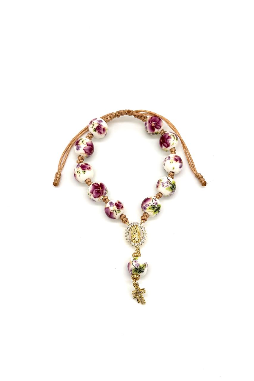 Pulsera denario elaborado en cerámica, crucero en rodio y micro zircón, cruz en rodio. Ajustable.Precio: 120,000 COP