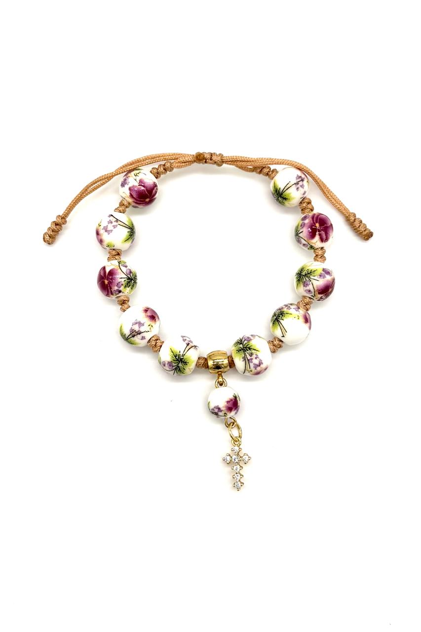 Pulsera denario elaborado con cerámica, cargadera en acero, cruz en rodio y micro zircón. Ajustable.Precio: 110,000 COP