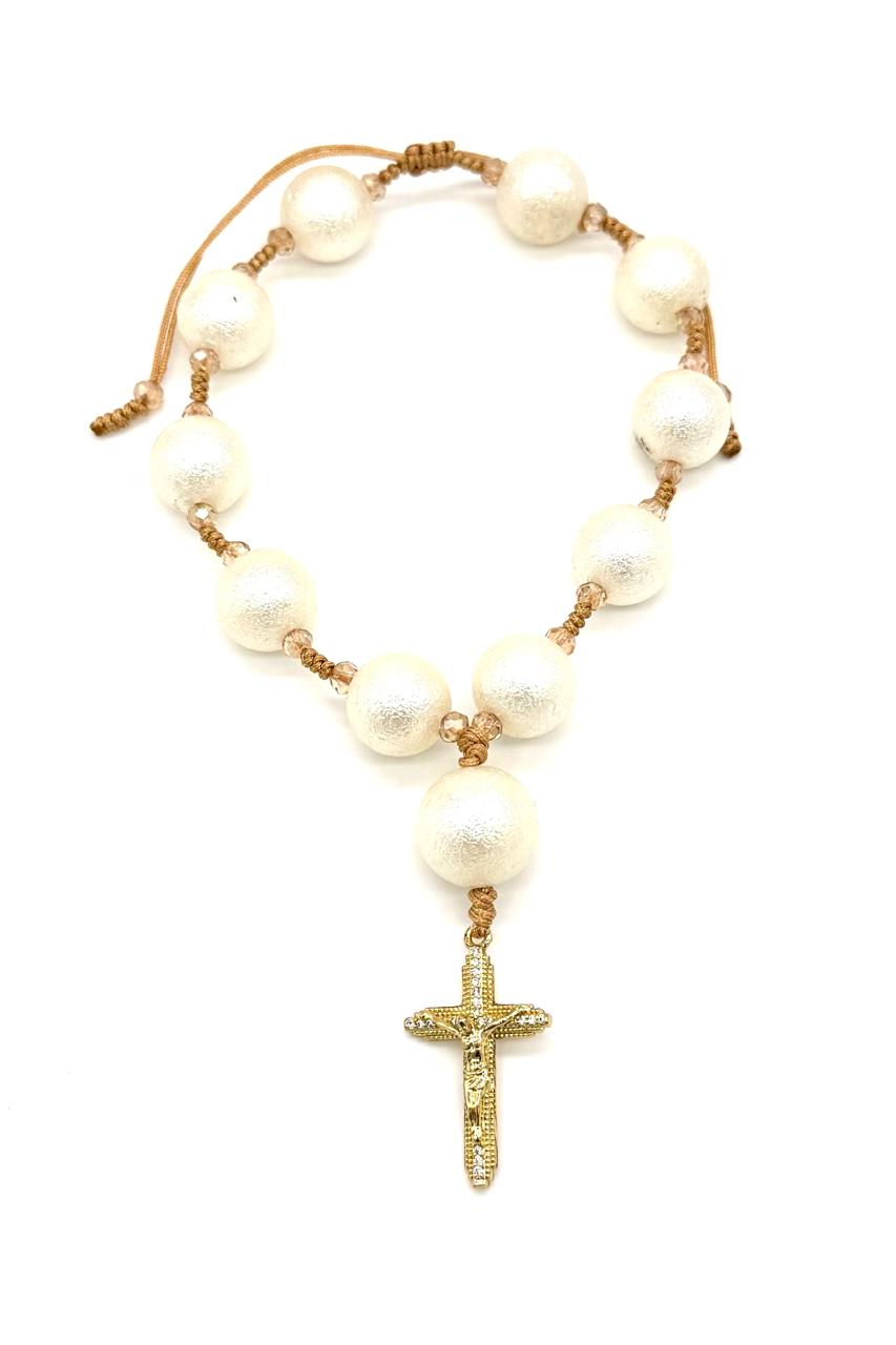 Pulsera Denario elaborada con perlas grameladas sintéticas, hilo Coreano, cruz en rodio y micro zircón, cristales Checos. Ajustable.Precio: 110,000 COP