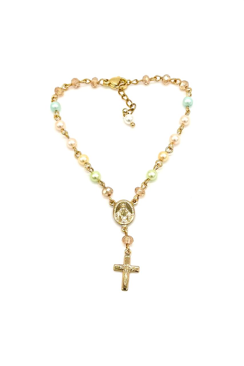Pulsera denario elaborada con perlas polvo de nácar, hilo goldfield micra oro, crucero y cruz en goldfield.Precio: 110,000 COP