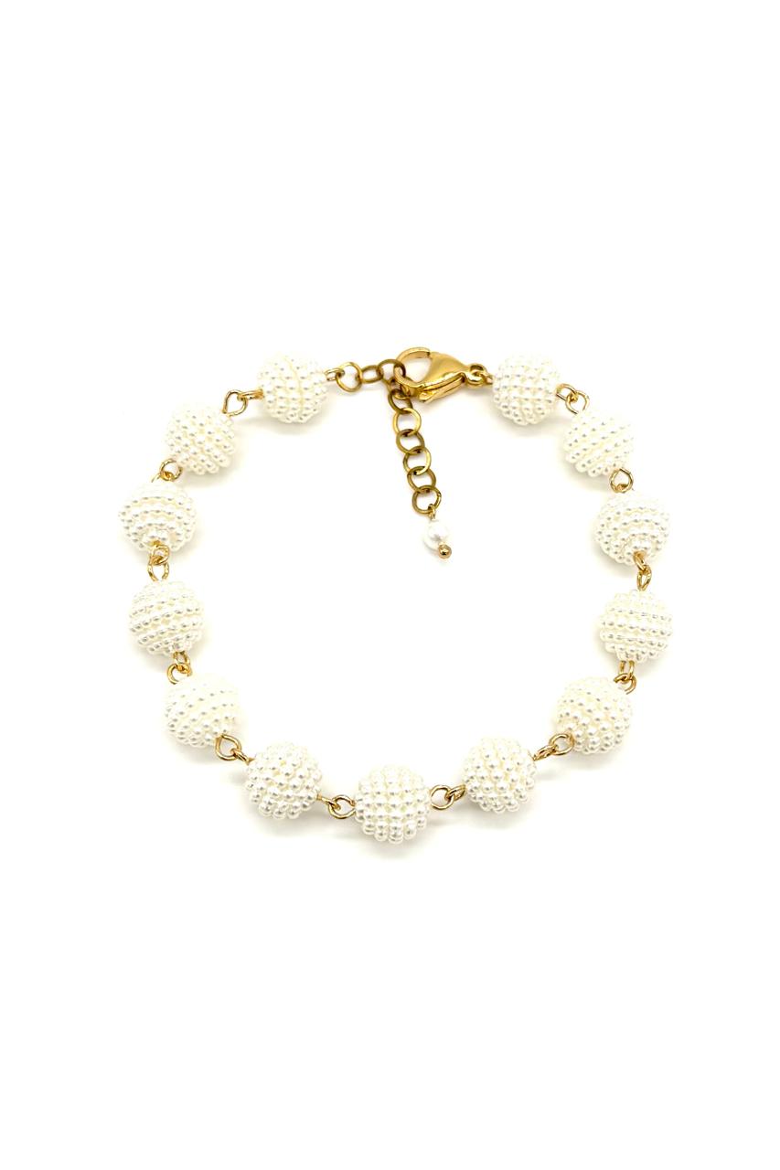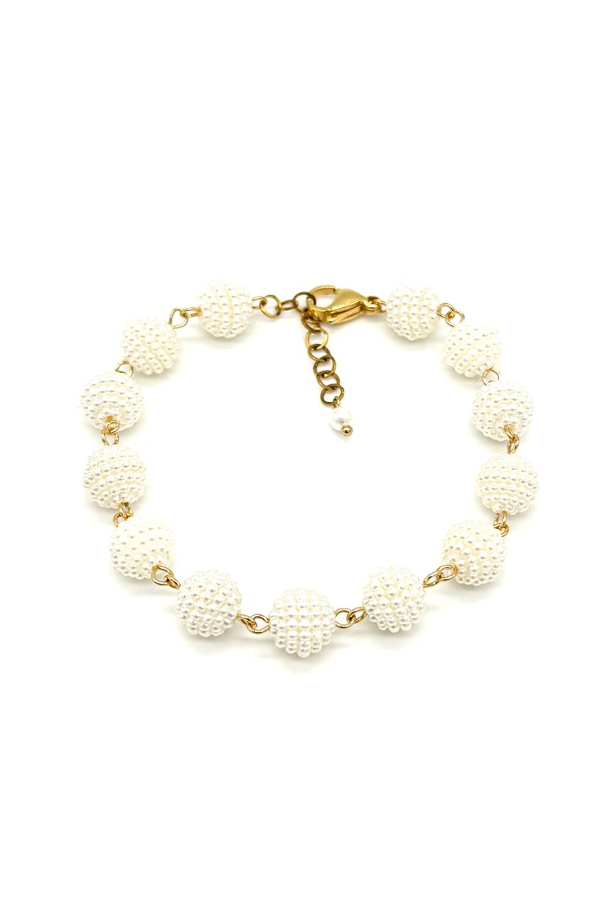Pulsera moritas elaborada con hilo goldfield micra oro, broche en rodio y moritas tipo perla sintéticas.Precio: 90,000 COP