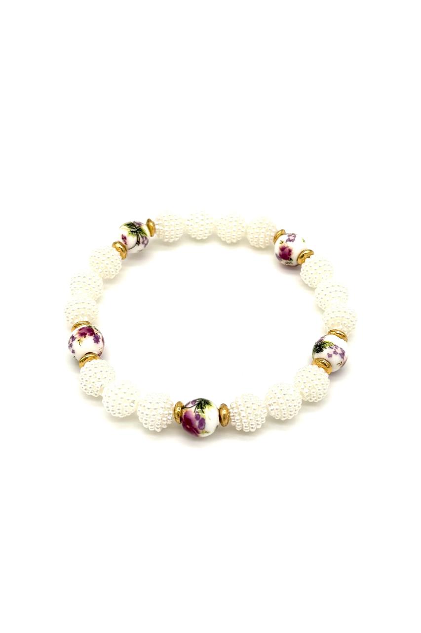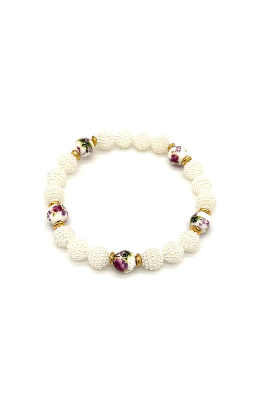 Pulsera moritas elaborada con perlas sintéticas, cerámica pintada, separadores en goldfield. Encauchada.Precio: 80,000 COP