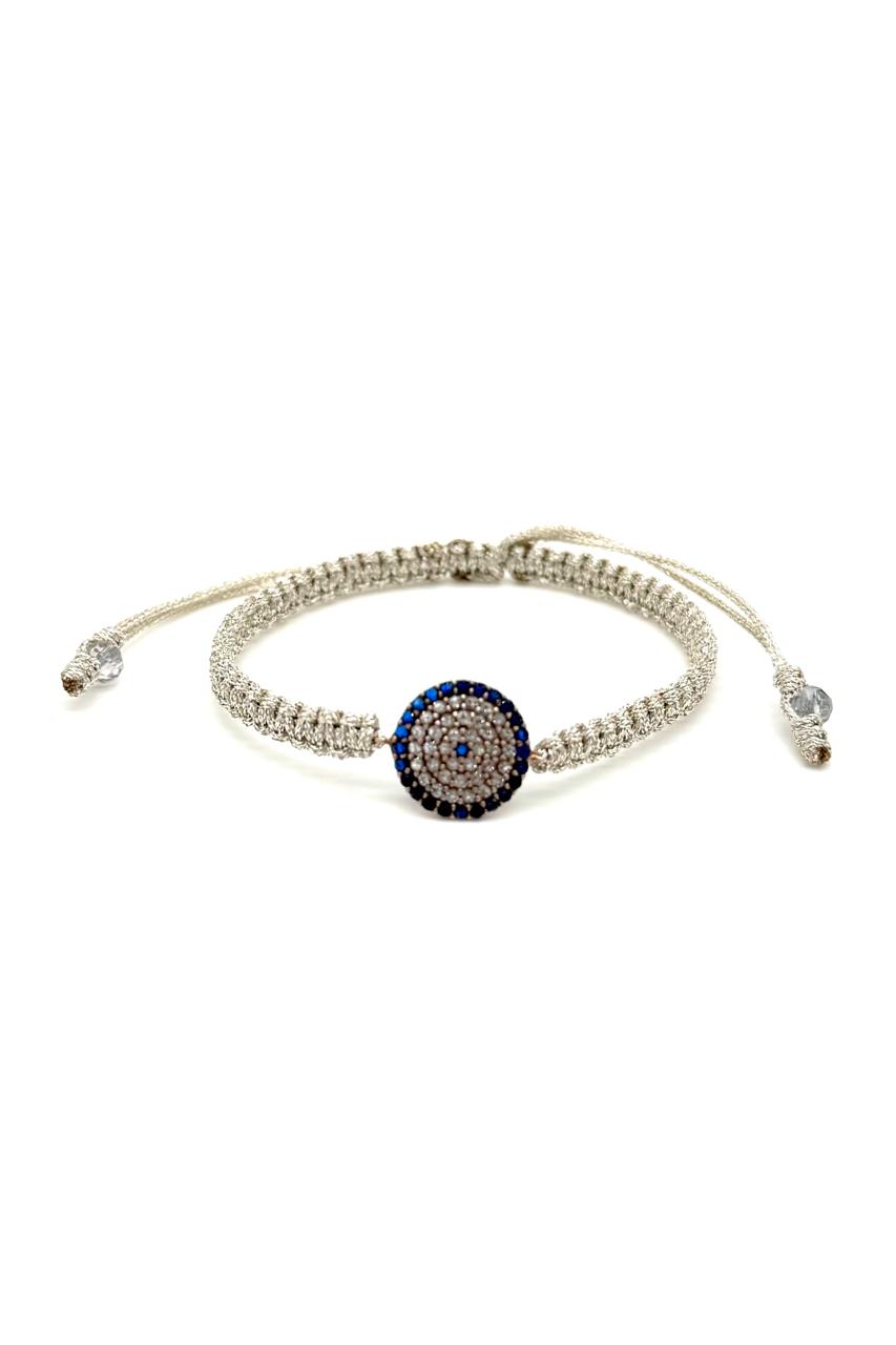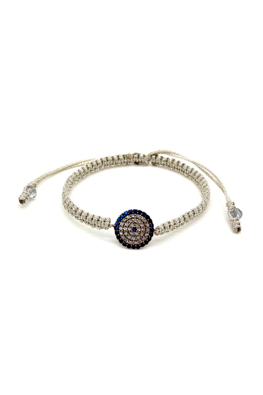 Pulsera ojo Turco elaborada con hilo metalizado Coreano, dije en rodio oro rosa y micro zircón. Ajustable.Precio: 60,000 COP