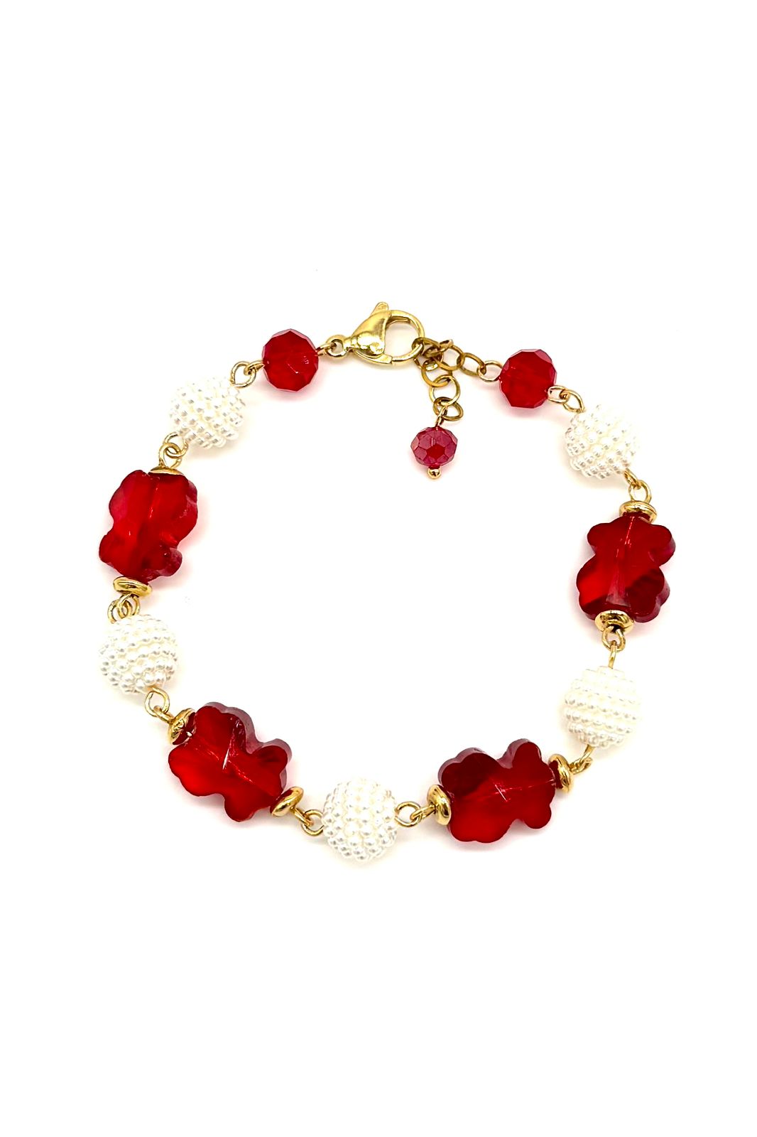 Pulsera oso elaborada con hilo goldfield micra oro, moritas tipo perla, oso en cristal Checo.Precio: 110,000 COP