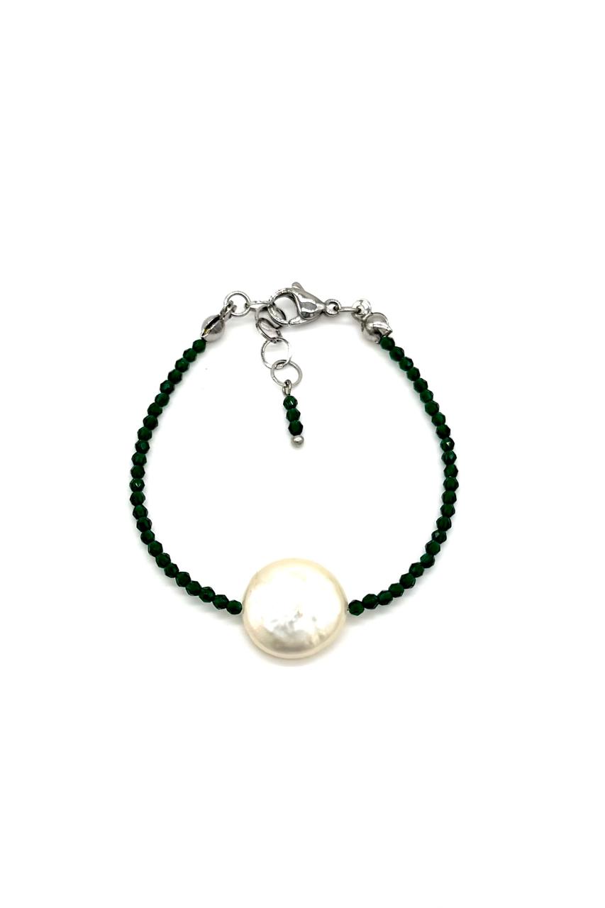Pulsera elaborada con perla cultivada, cristal Checo, broche en acero.Precio: 140,000 COP