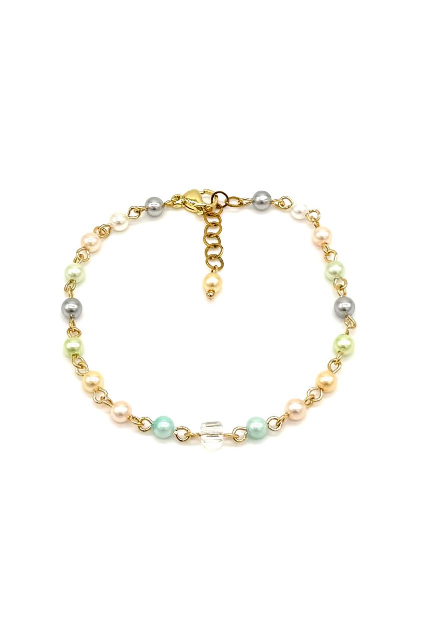 Pulsera elaborada con perlas polvo de nácar, hilo goldfield micra oro, cristal murano aurora boreal.Precio: 90,000 COP