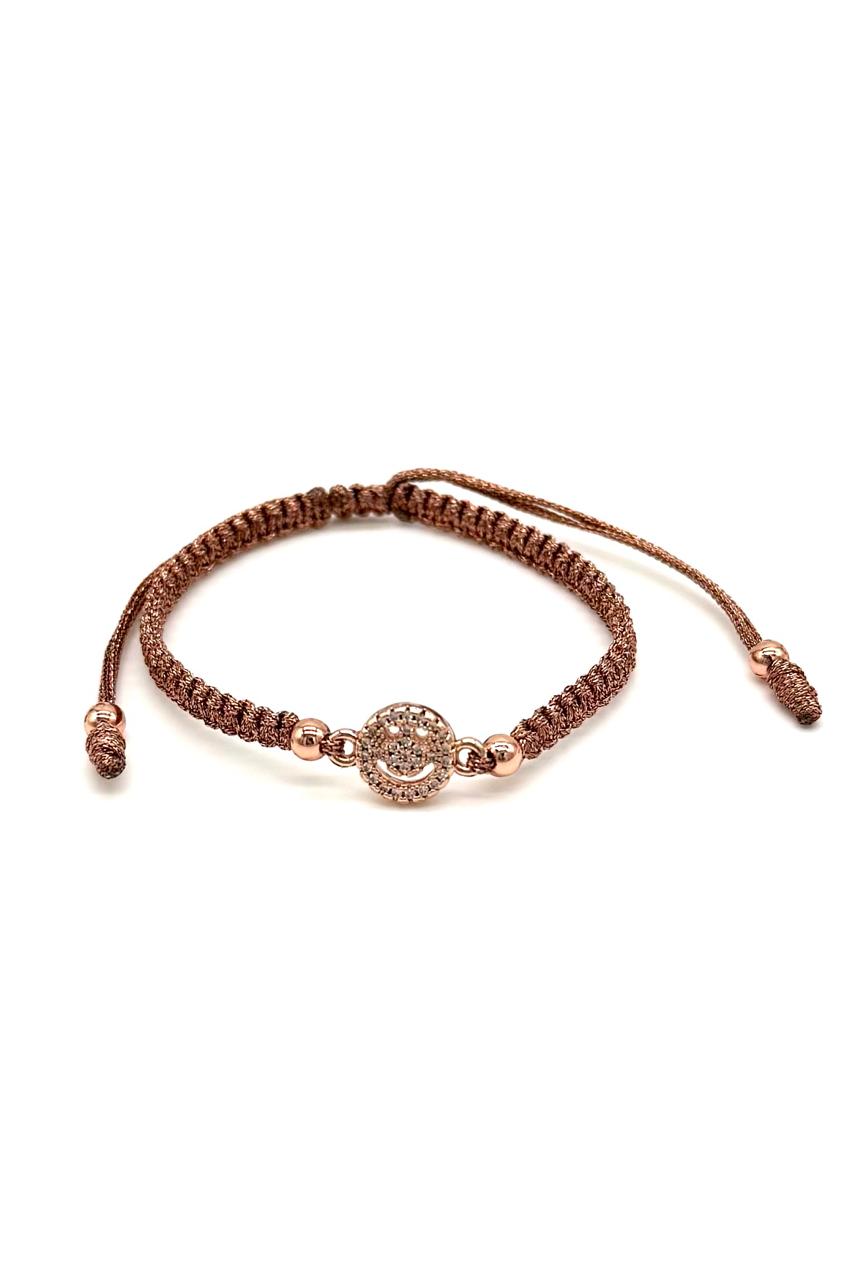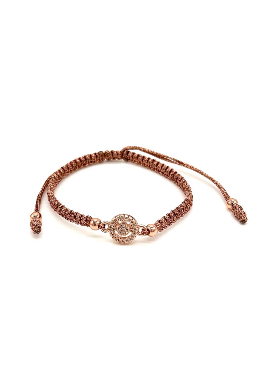 Pulsera Smile elaborada con hilo Coreano oro rosa metalizado, dije en rodio oro rosa y micro zircón. Ajustable.Precio: 60,000 COP